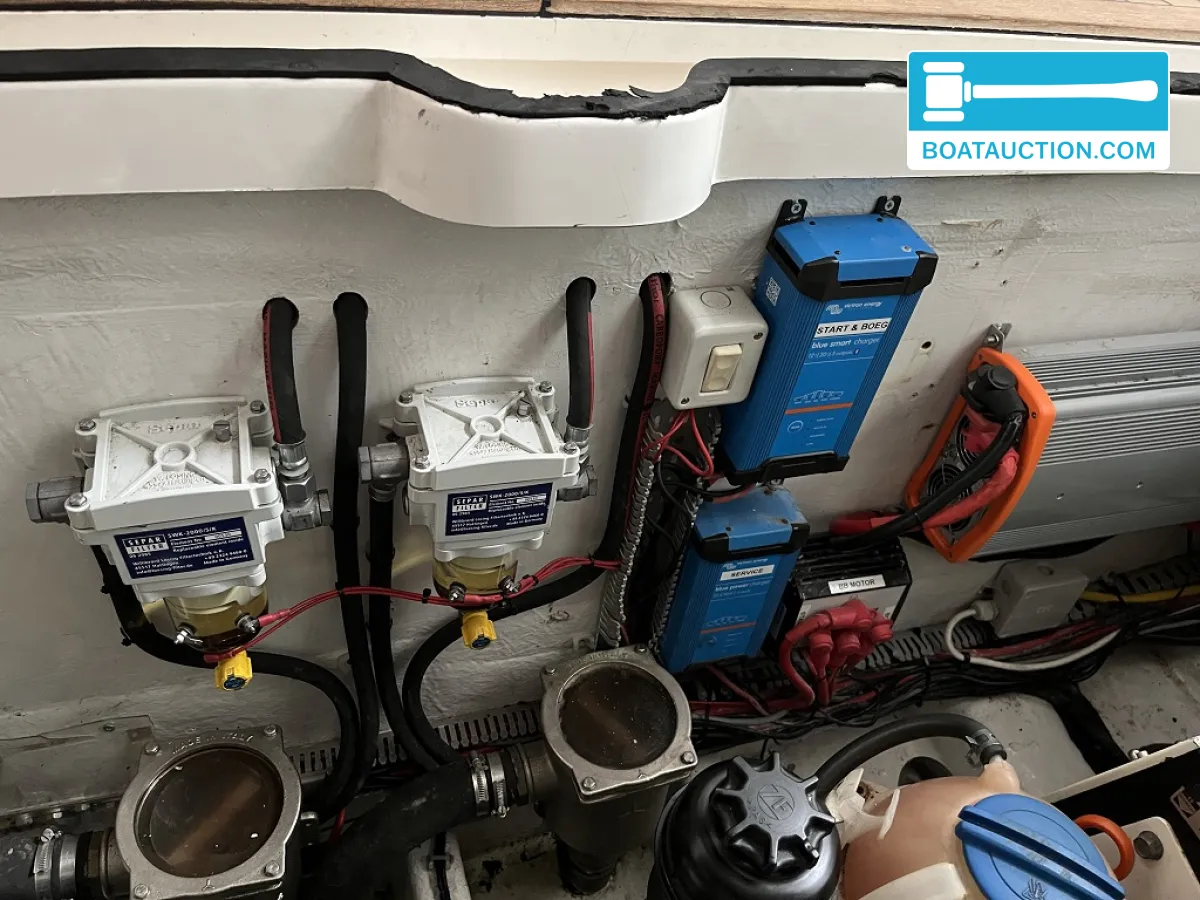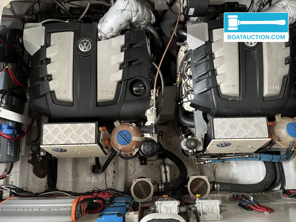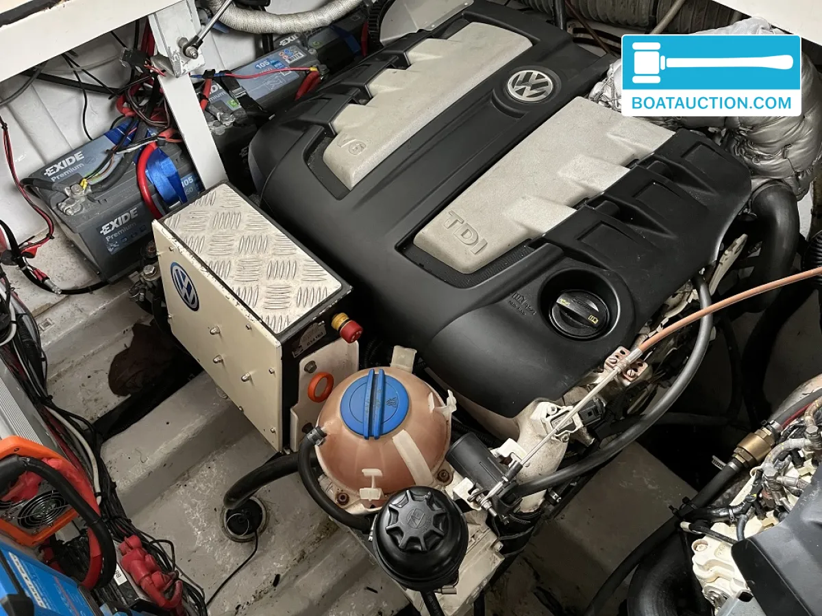 Motorisatie en technische specificatiesDe boot is uitgerust met twee inboard Volkswagen TDI 260 dieselmotoren, elk met een vermogen van 224 pk en zes cilinders. Beide motoren zijn elektrisch gestart en functioneren naar behoren. De motoren zijn gekoppeld aan een stuurwielbesturing en worden ondersteund door een boeg- en hekschroef, wat het manoeuvreren in havens en smalle waterwegen vergemakkelijkt. Het brandstofverbruik bedraagt 420 liter, wat aangeeft dat de boot geschikt is voor langere tochten.