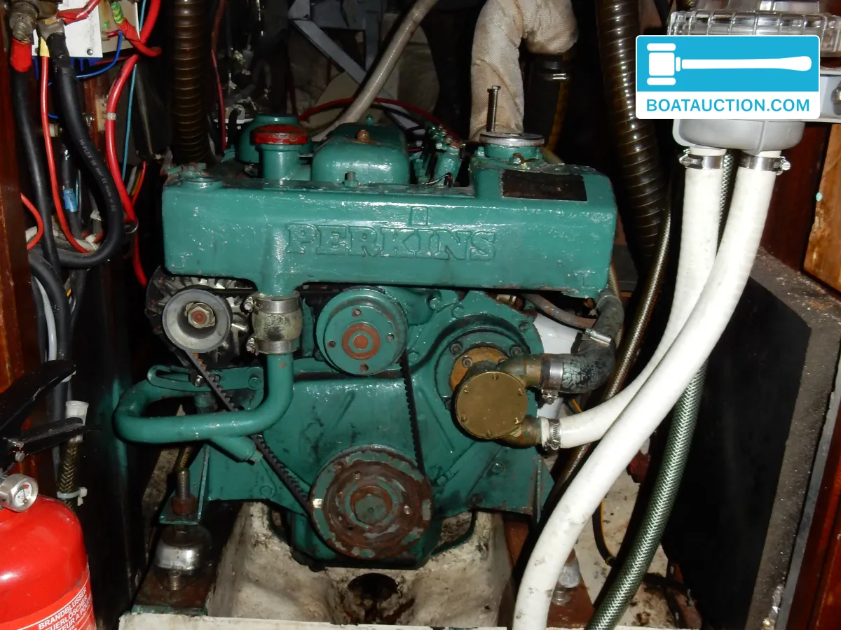 Motorisatie en technische uitrustingDe Hawk 42 is uitgerust met een Perkins inboard dieselmotor met een vermogen van 55 pk, verdeeld over vier cilinders. De motor start elektrisch en heeft een gemiddeld verbruik van 3,5 liter per uur. De kruissnelheid ligt rond de 10 km/u, met een maximumsnelheid van 12 km/u. De motor is operationeel en wordt ondersteund door meetinstrumenten zoals een brandstoftankmeter, oliedrukmeter, temperatuurmeter en toerenteller.