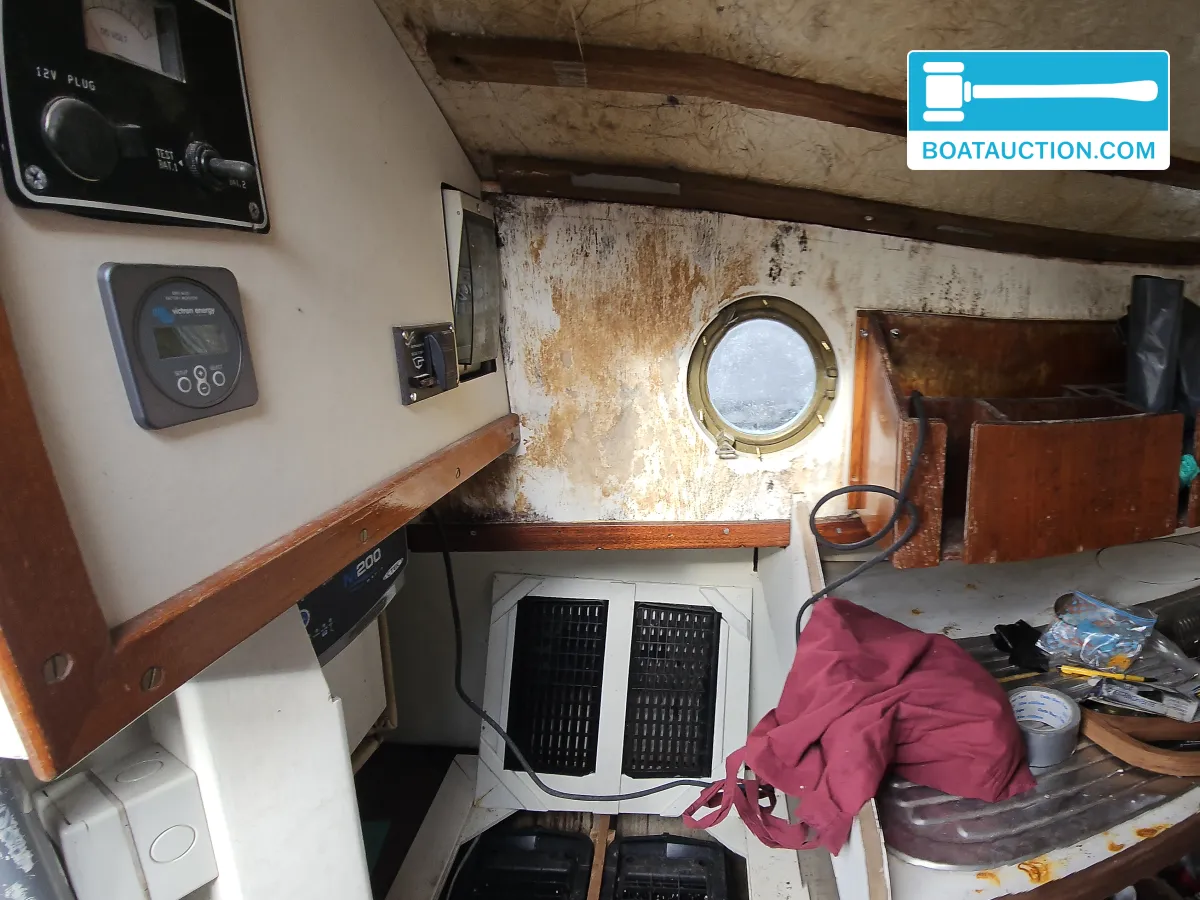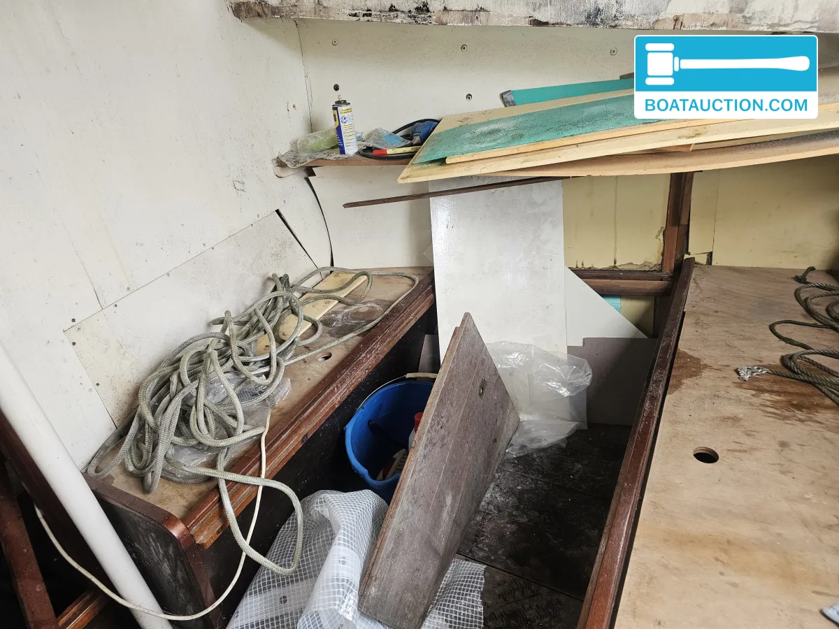 Interieur en voorzieningenBinnenin is de boot voorzien van een eethoek en een koelkast. Er is een handmatig toilet aanwezig waarvan de afvoer direct in het open water uitkomt. Voor verwarming is er een hete lucht systeem geïnstalleerd. De binnenruimte is niet afgewerkt en biedt ruimte voor verdere inrichting naar eigen wens. De binnenkant van de boot dient nog opgeknapt te worden, wat mogelijkheden biedt voor personalisatie.