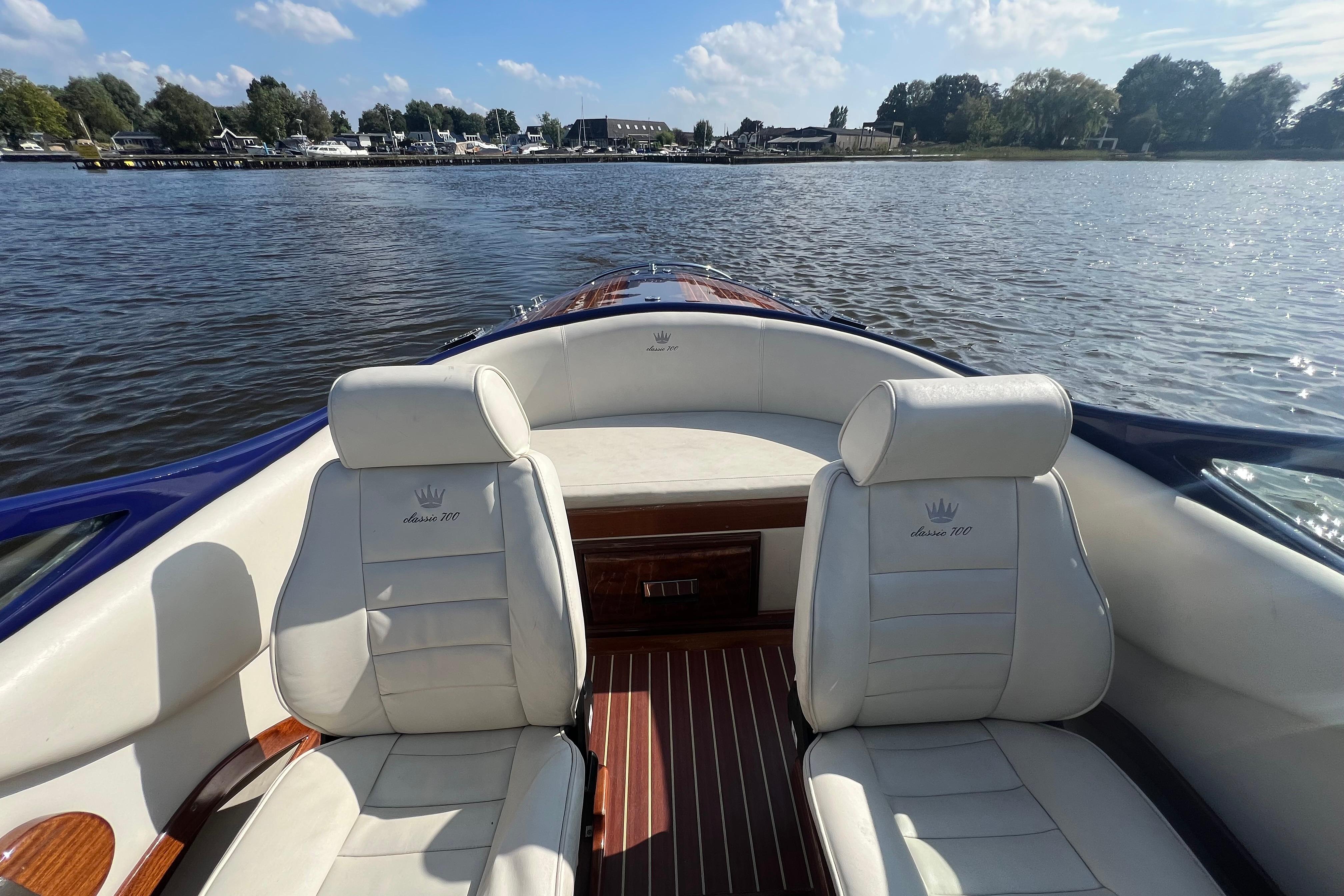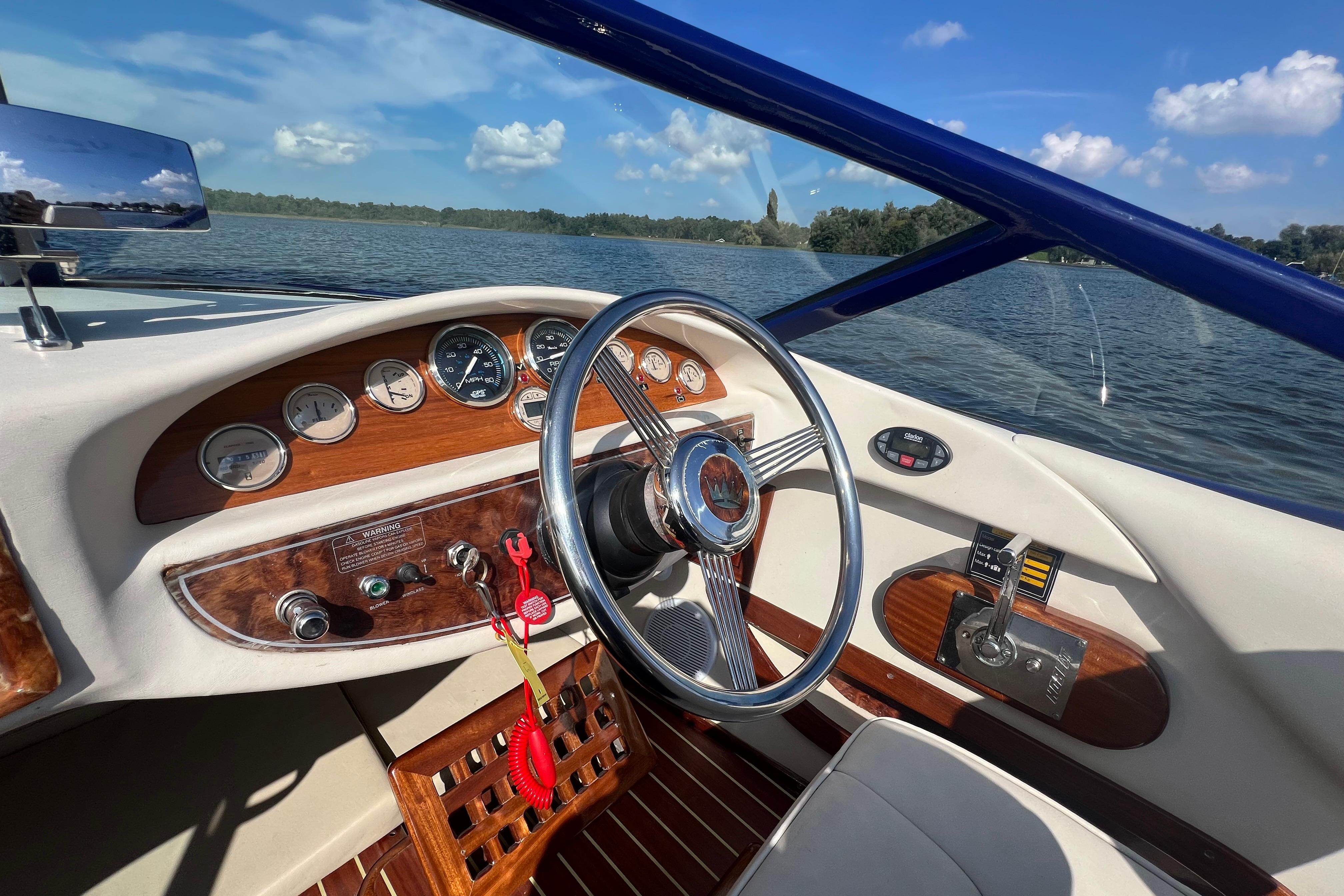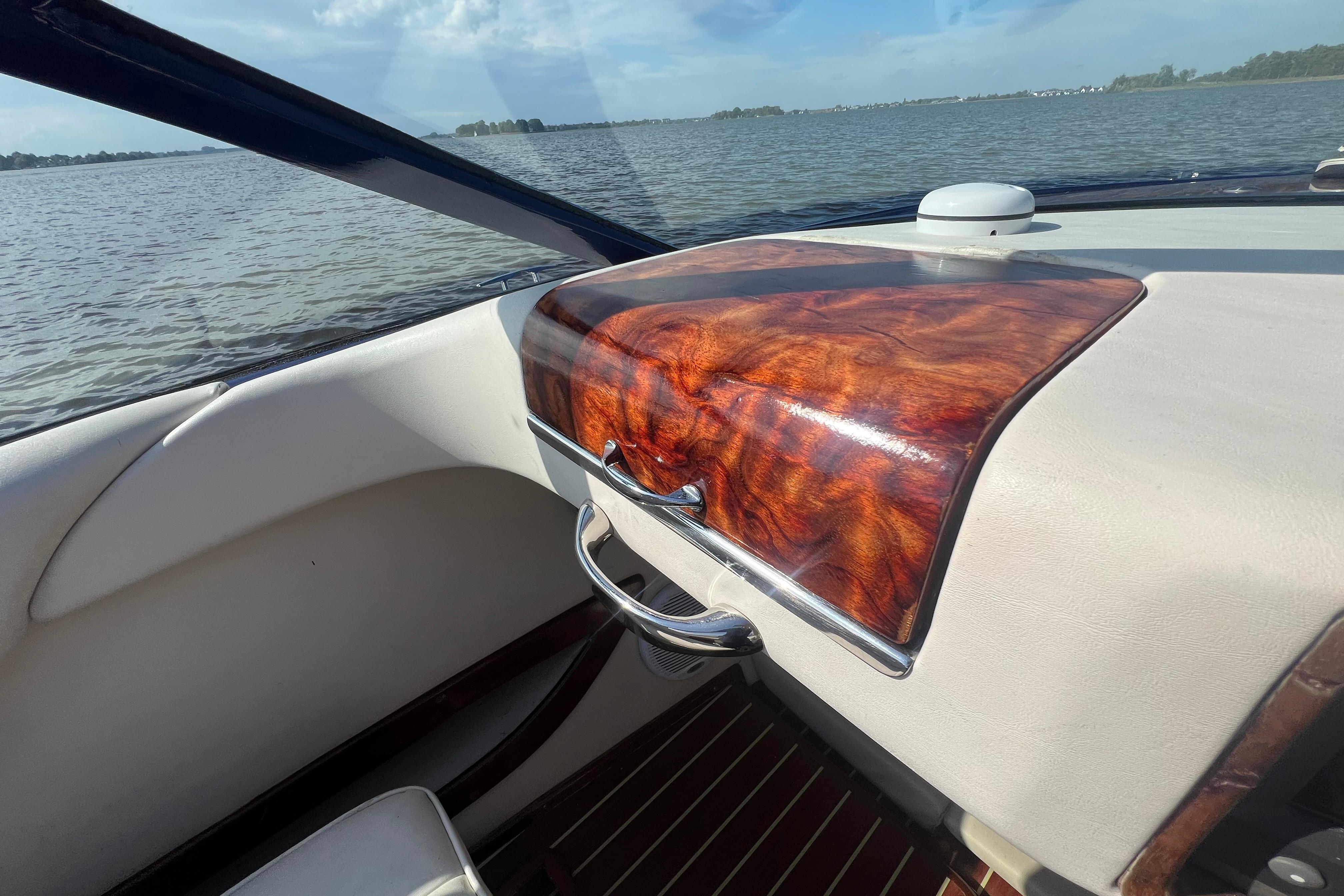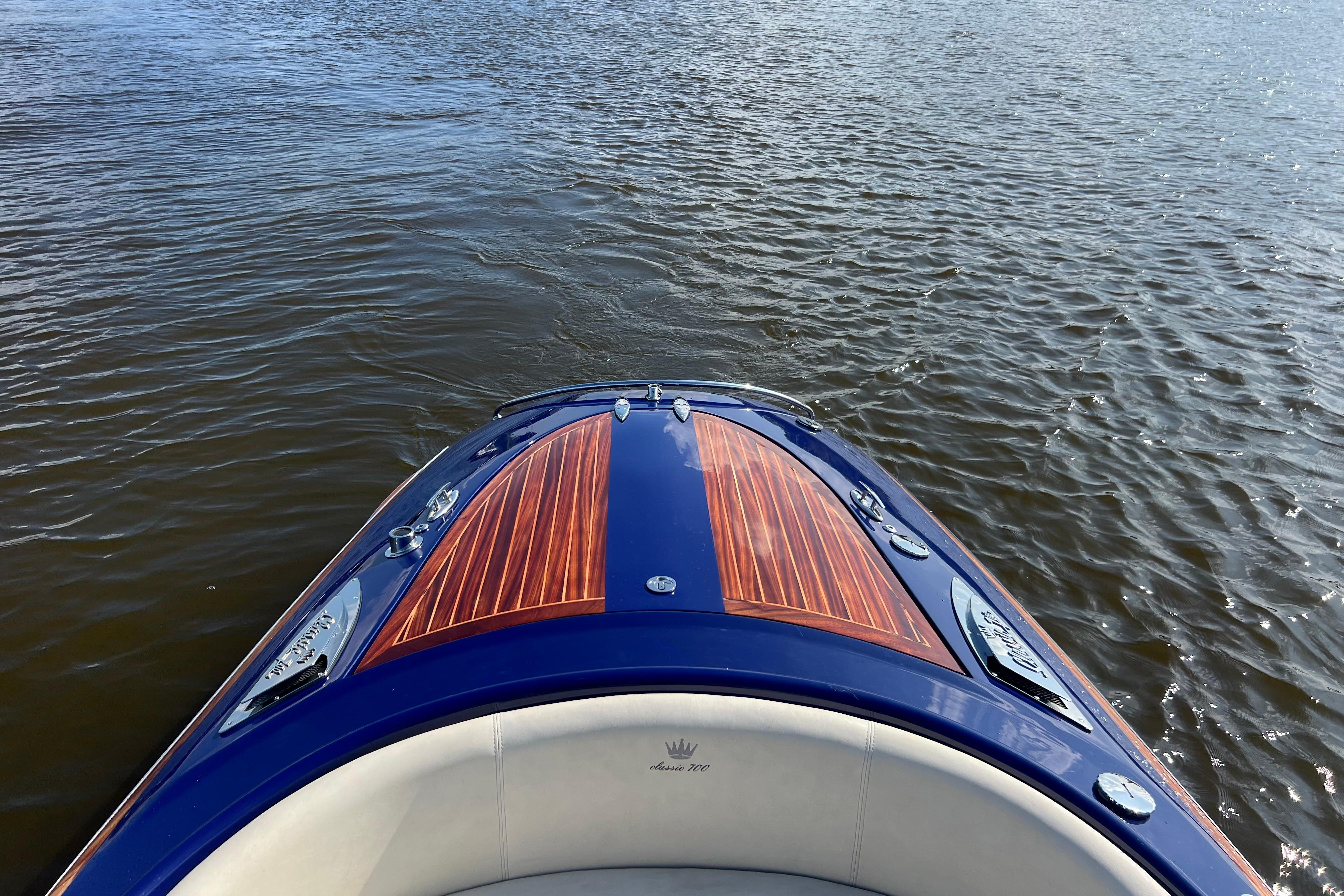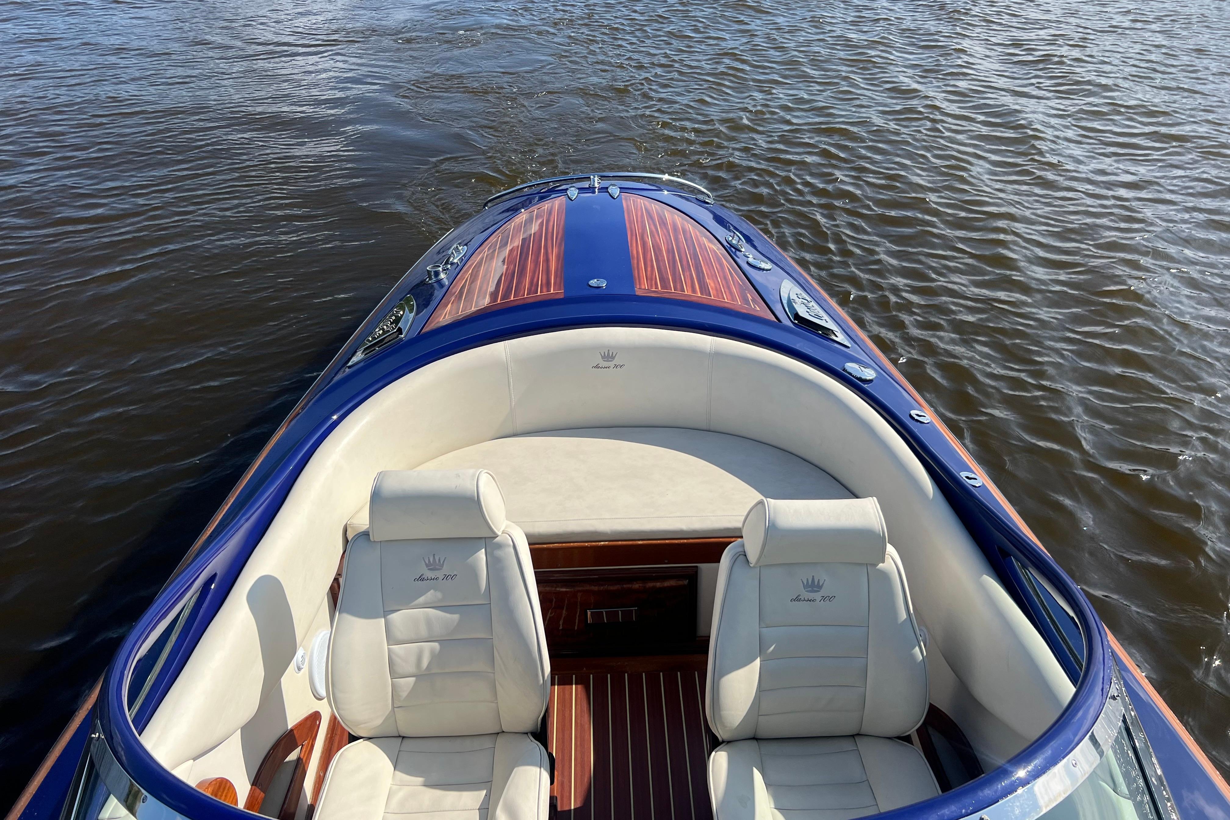 Deze prachtige KRAL 700 combineert klassieke luxe met moderne prestaties. De boot is met de hand gebouwd uit 12 lagen GRP (18 mm romp) en afgewerkt met hoogwaardig Sappeli Mahonie. Dankzij het doordachte ontwerp en hoogwaardige afwerking straalt deze boot klasse en kwaliteit uit.