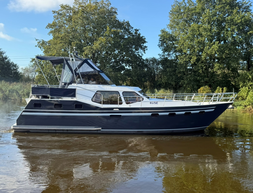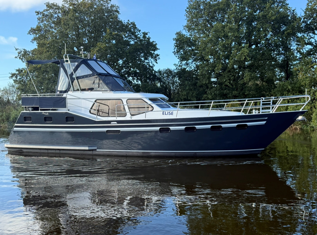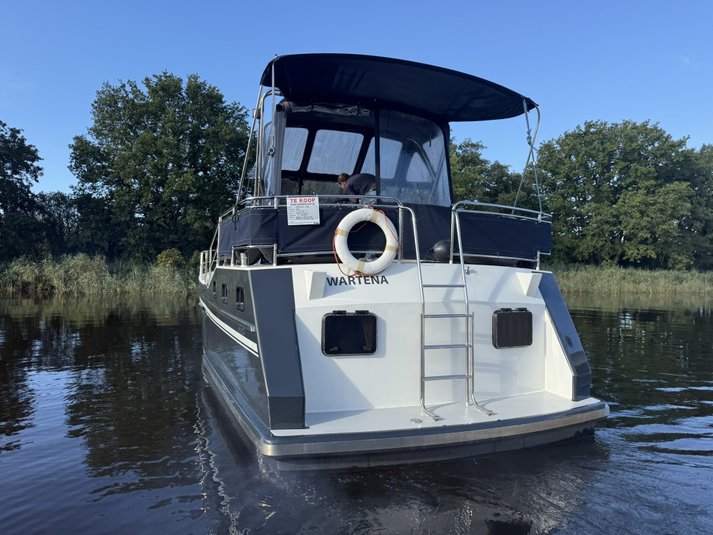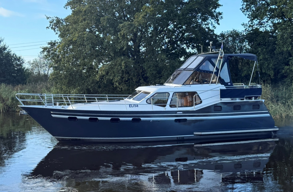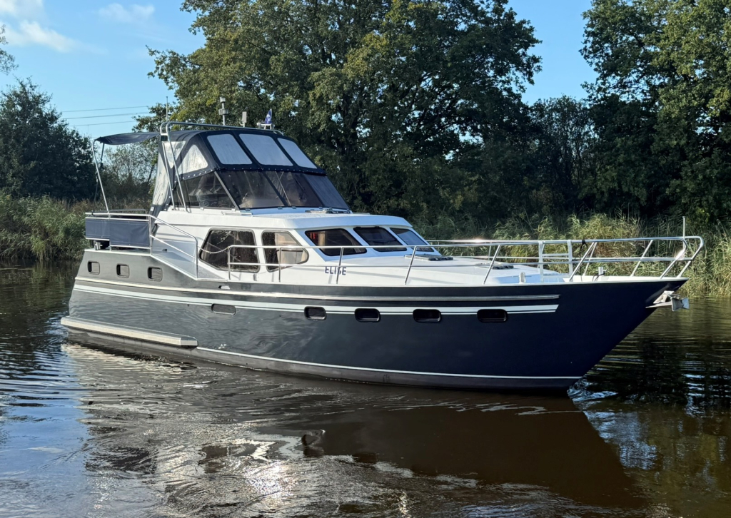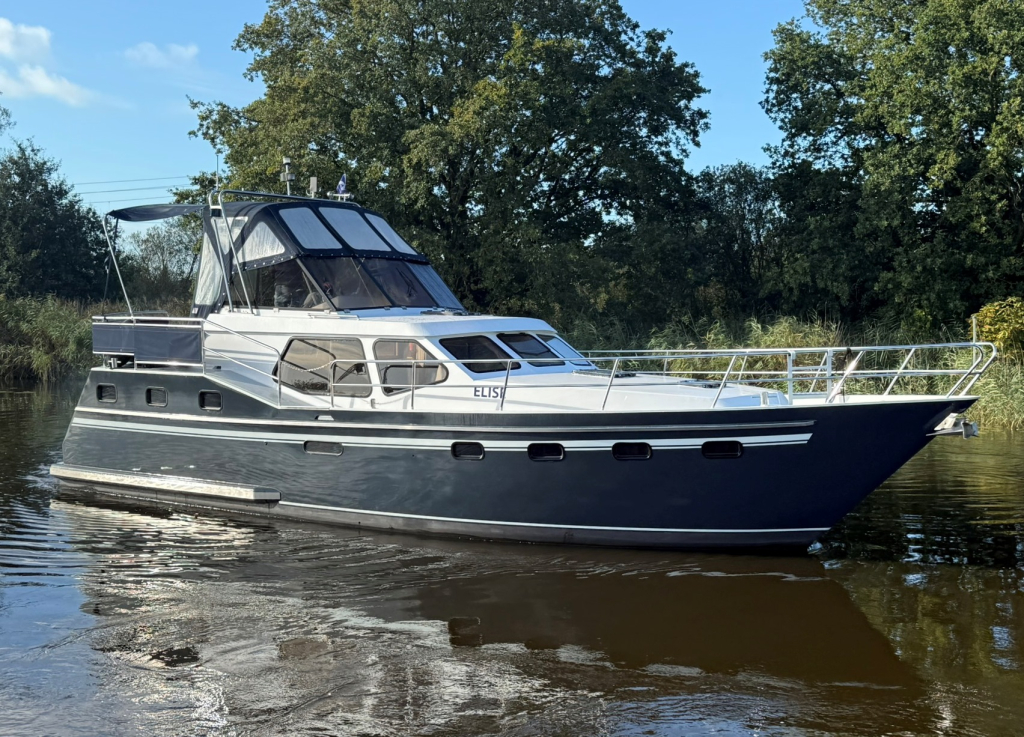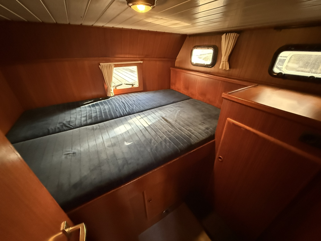 Ruim breed en stoer motorschip met boeg en hekschroef