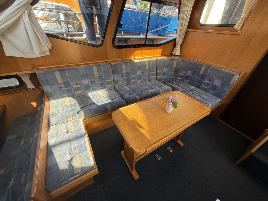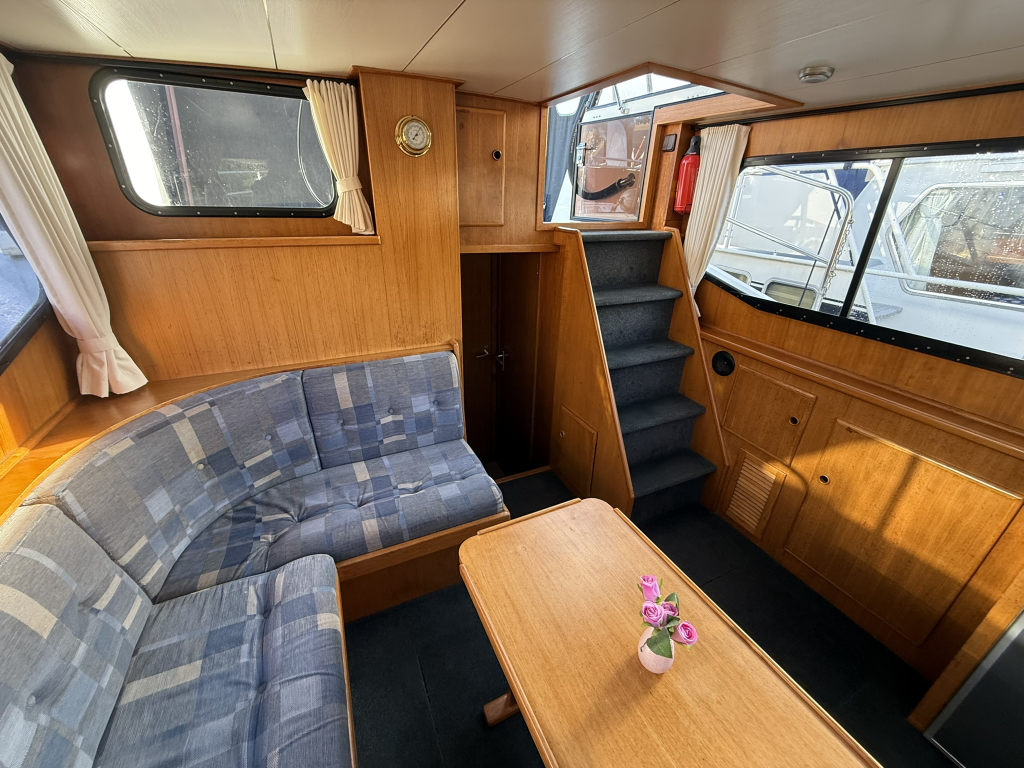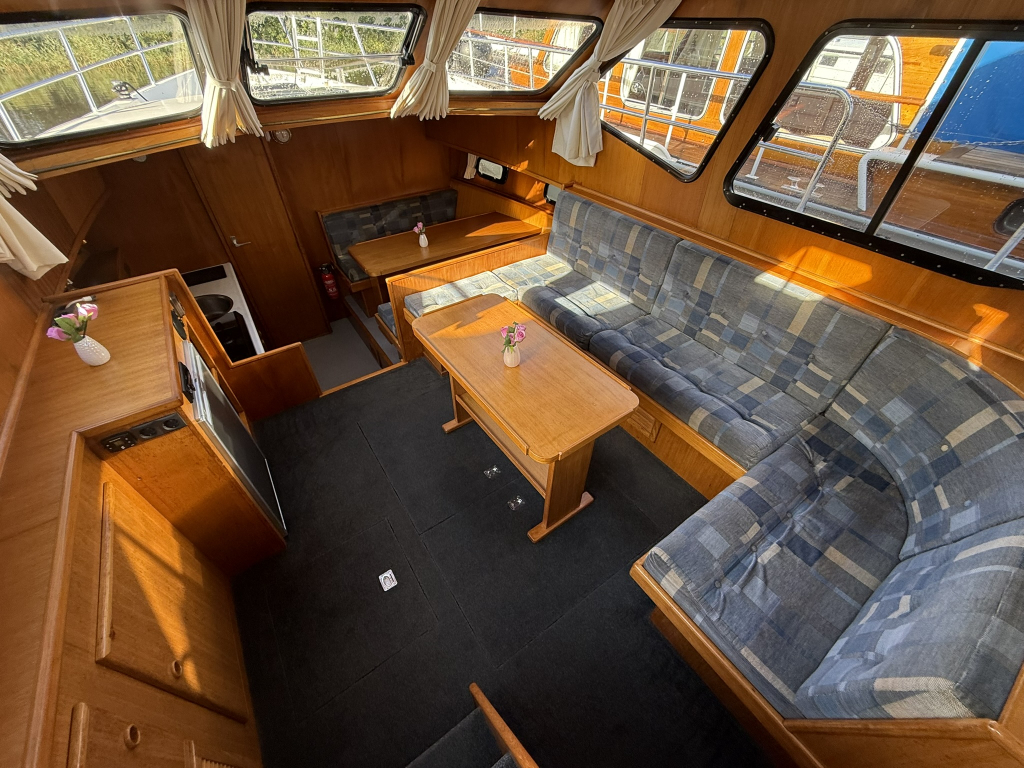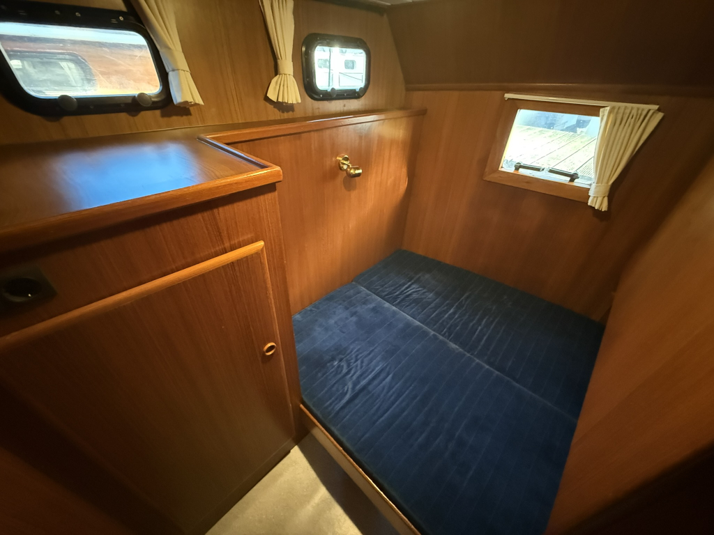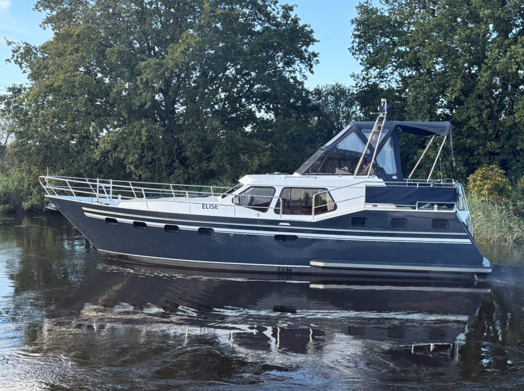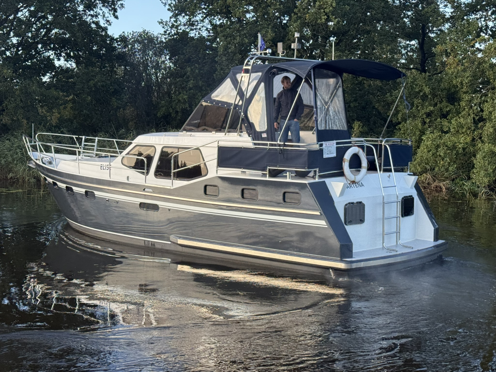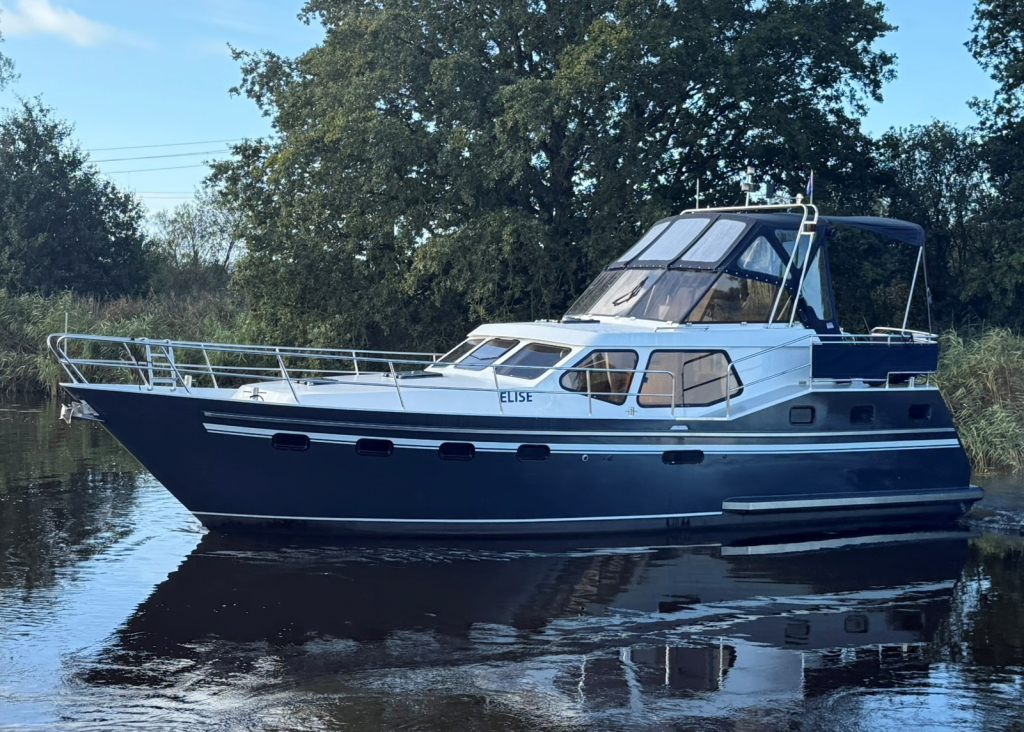 Ruim breed en stoer motorschip met boeg en hekschroef