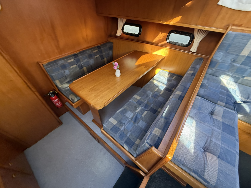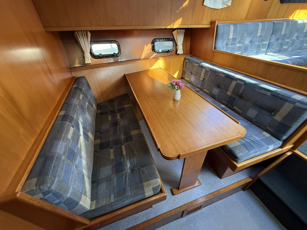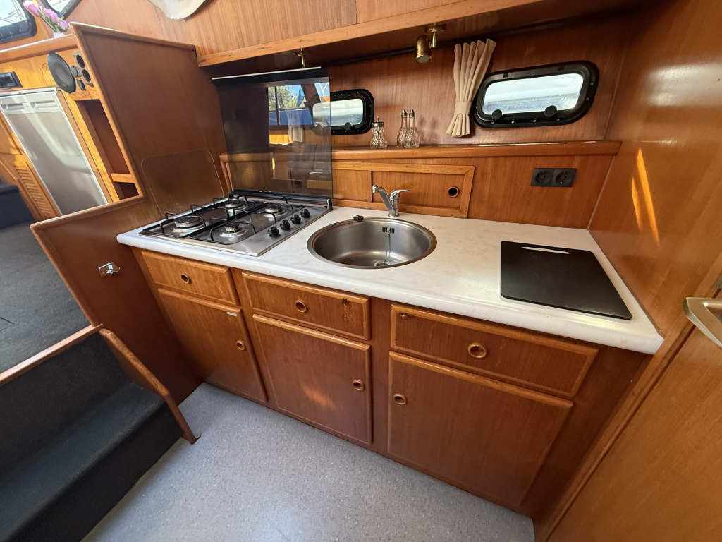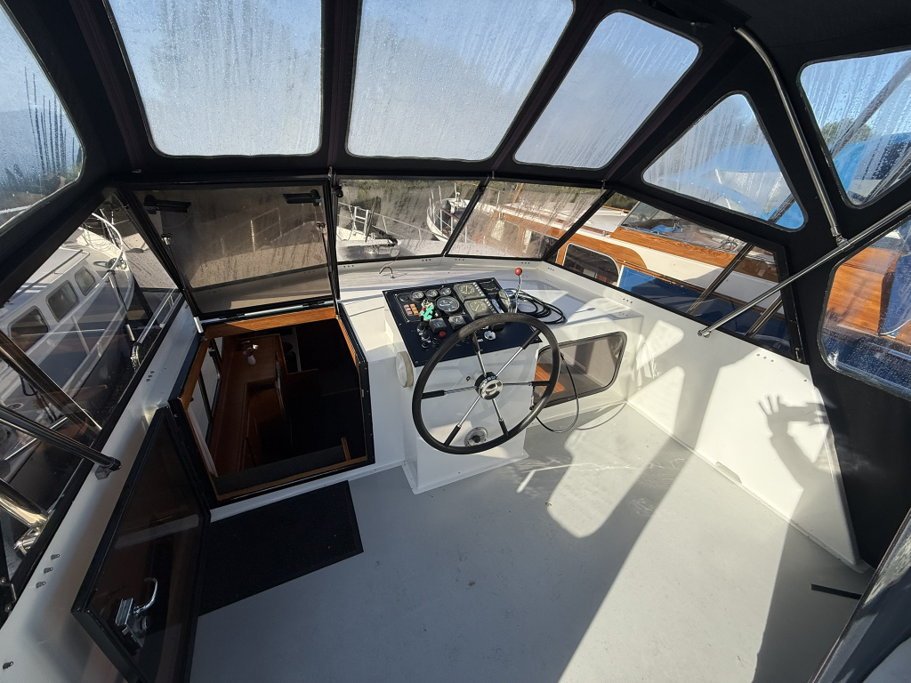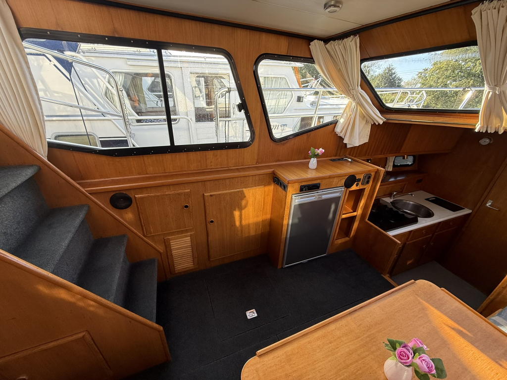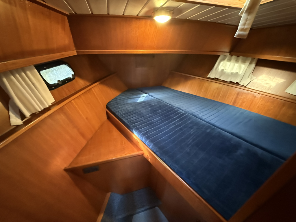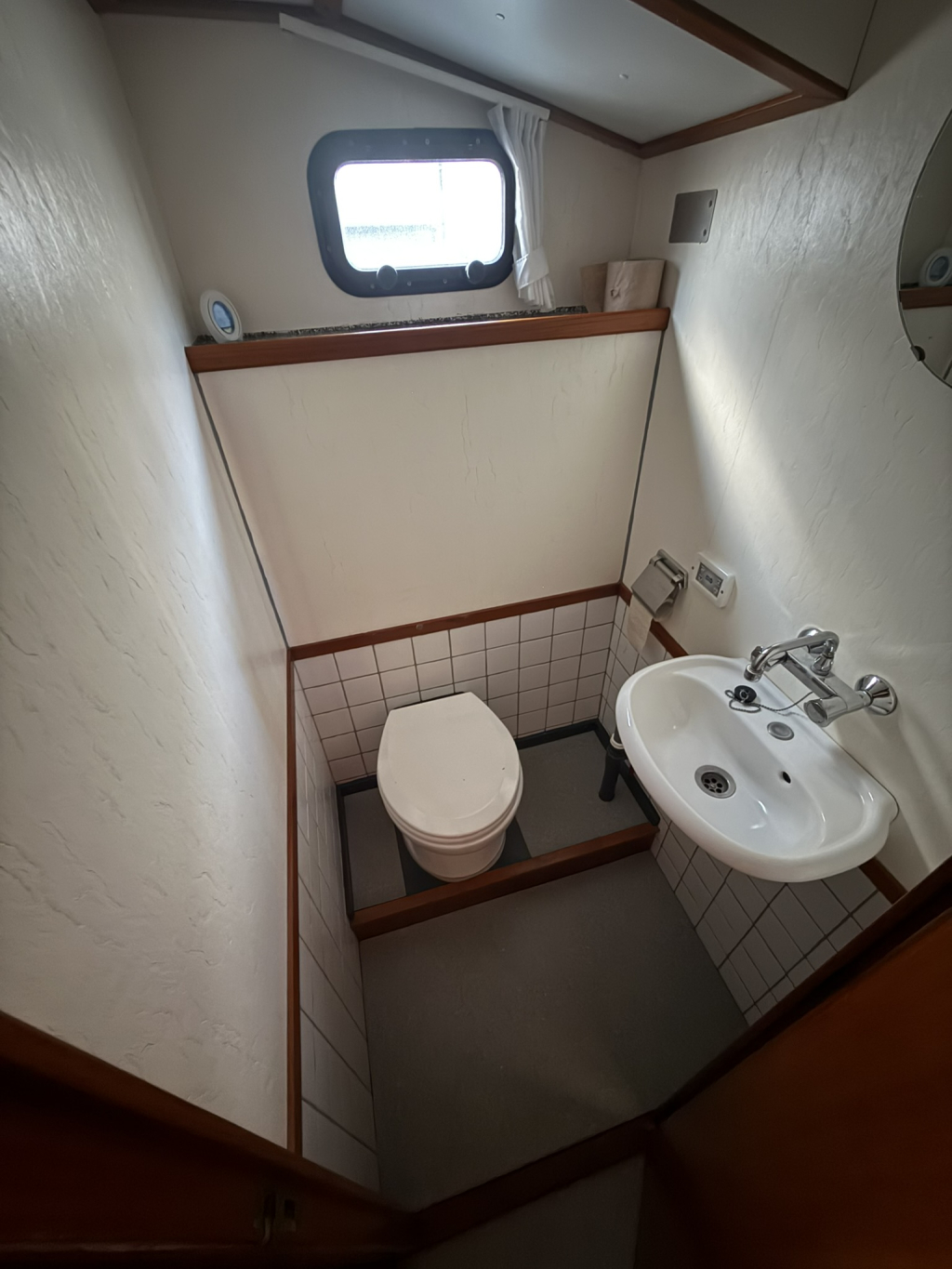 Ruim breed en stoer motorschip met boeg en hekschroef