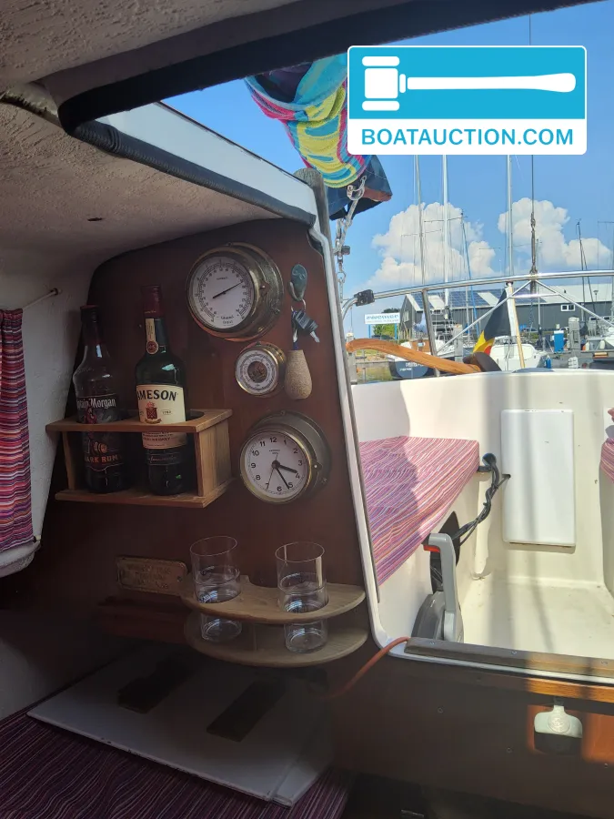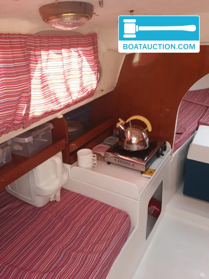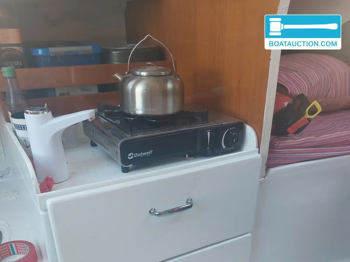 Midget 20 nu in de online veiling. Iedereen kan meebieden tot en met 19 januari 2026.Binnenin biedt de Midget 20 ruimte aan twee vaste slaapplaatsen en een extra slaapplaats, wat het schip geschikt maakt voor korte vakanties of weekendverblijven op het water. De stahoogte binnen bedraagt 1,20 meter, wat kenmerkend is voor een boot van dit formaat. De aanwezige matrassen en het eenvoudige kooktoestel maken het mogelijk om aan boord te overnachten en te koken. Het handmatig toilet is aangesloten op een directe afvoer naar open water.