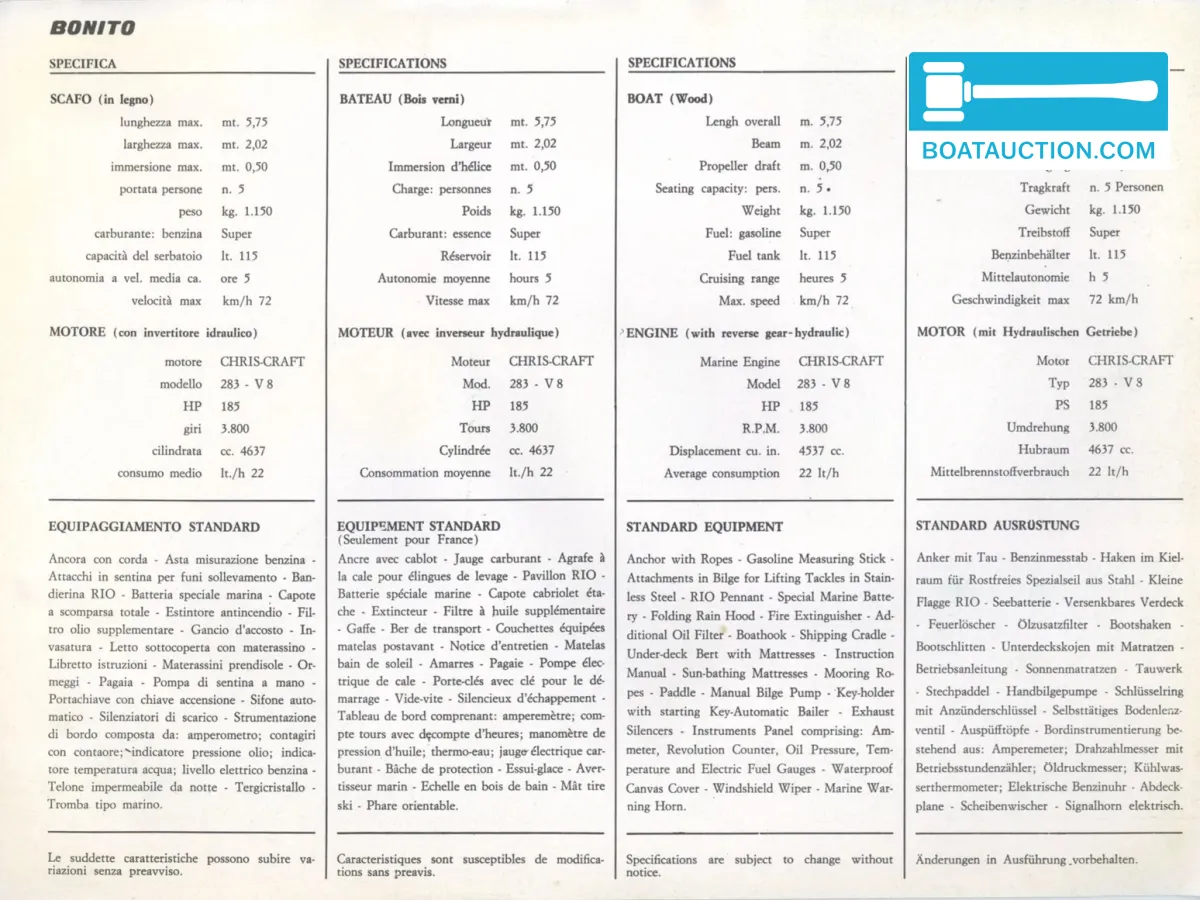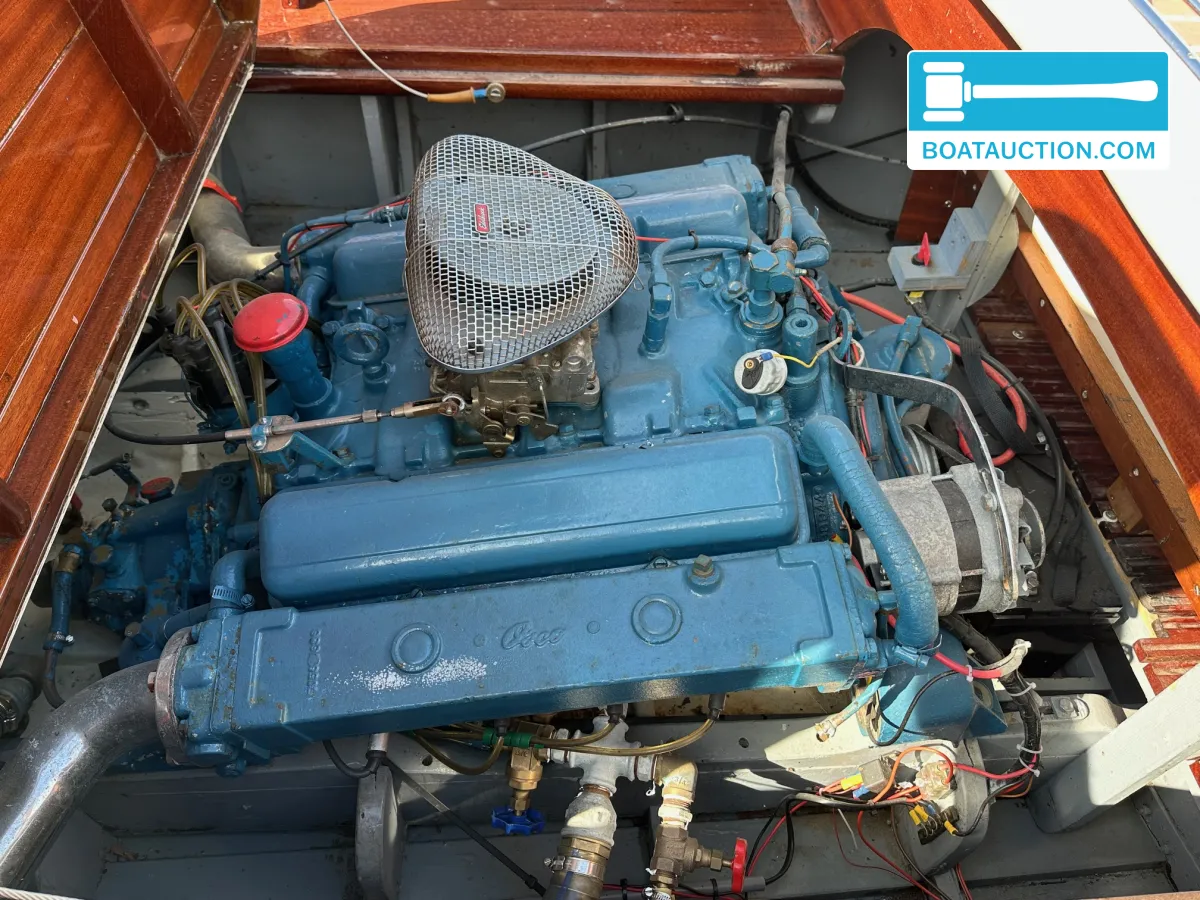 Motorisatie: Chris Craft 283 V8 benzinemotorDe Rio Bonito is uitgerust met een inboard benzinemotor van het merk Chris Craft, type 283. Deze motor beschikt over acht cilinders en levert een vermogen van 185 pk. De motor wordt elektrisch gestart en is momenteel werkend. De motor kan draaiend worden getoond.. Met een kruissnelheid van circa 72 kilometer per uur biedt deze motorboot sportieve prestaties, passend bij het klassieke racebootontwerp.
