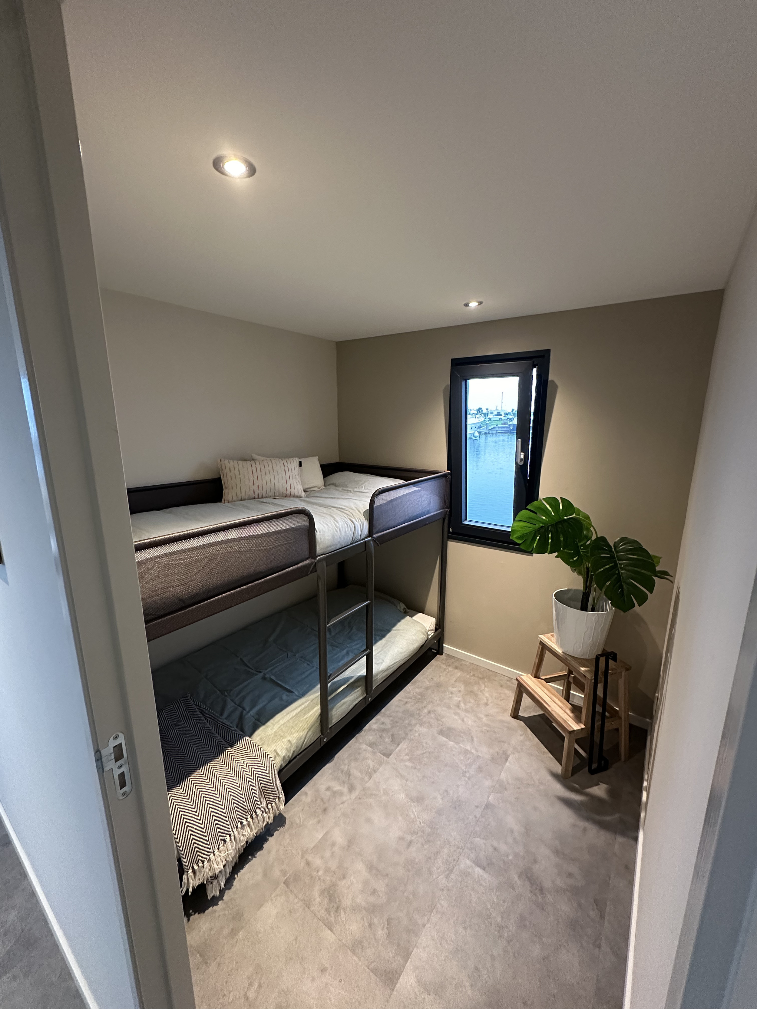 Er zijn twee slaapkamers met genoeg kastruimte. 1 masterbedroom met een tweepersoonsbed 140 bij 200. En een slaapkamer met een stapelbed.