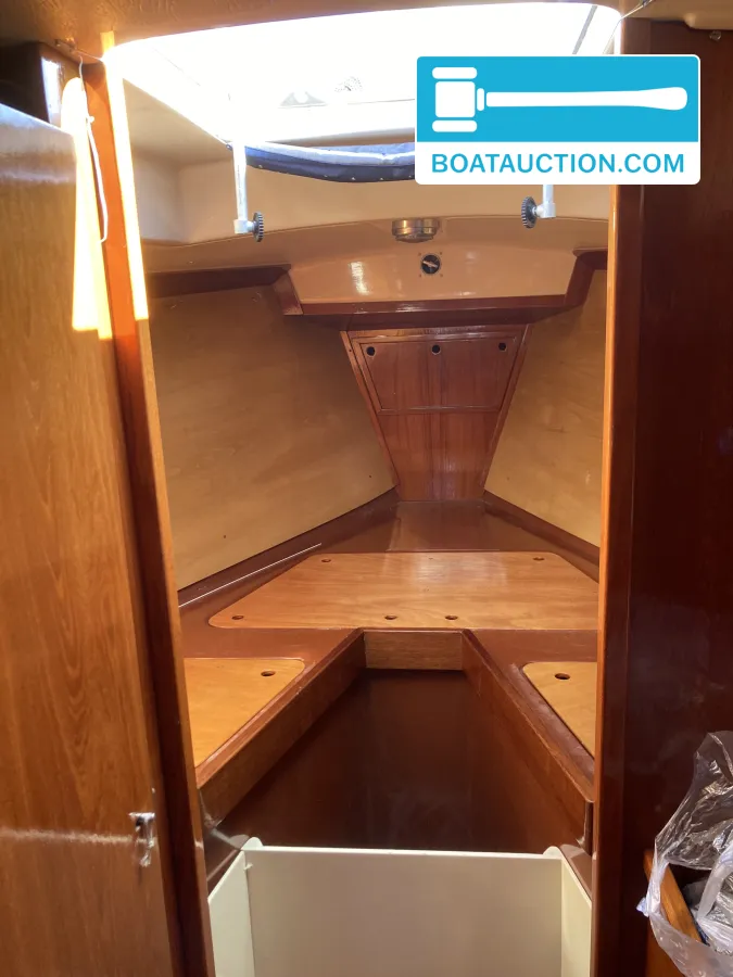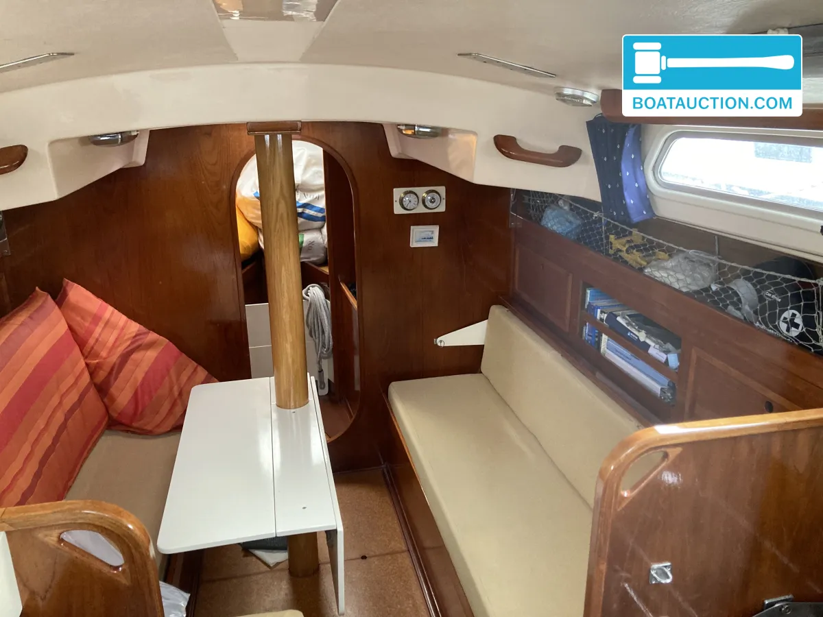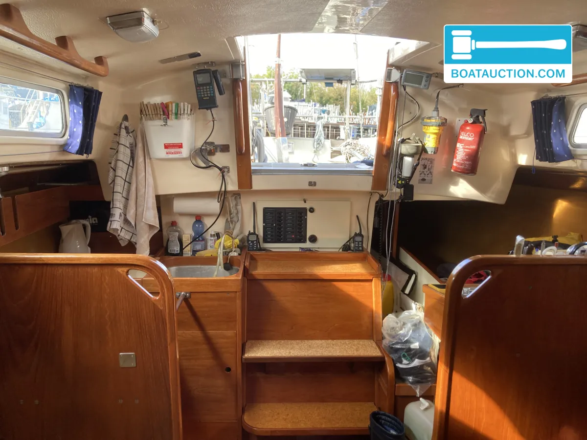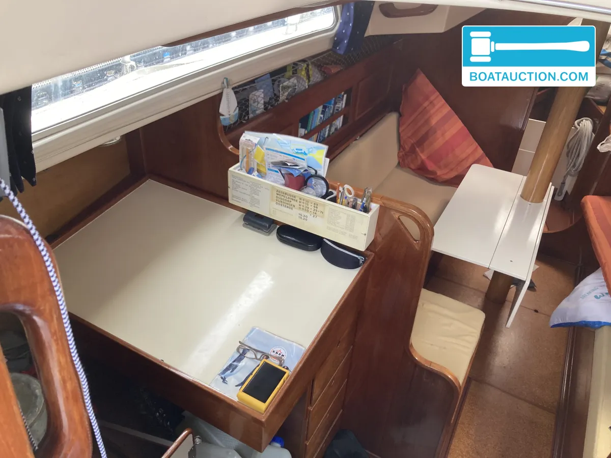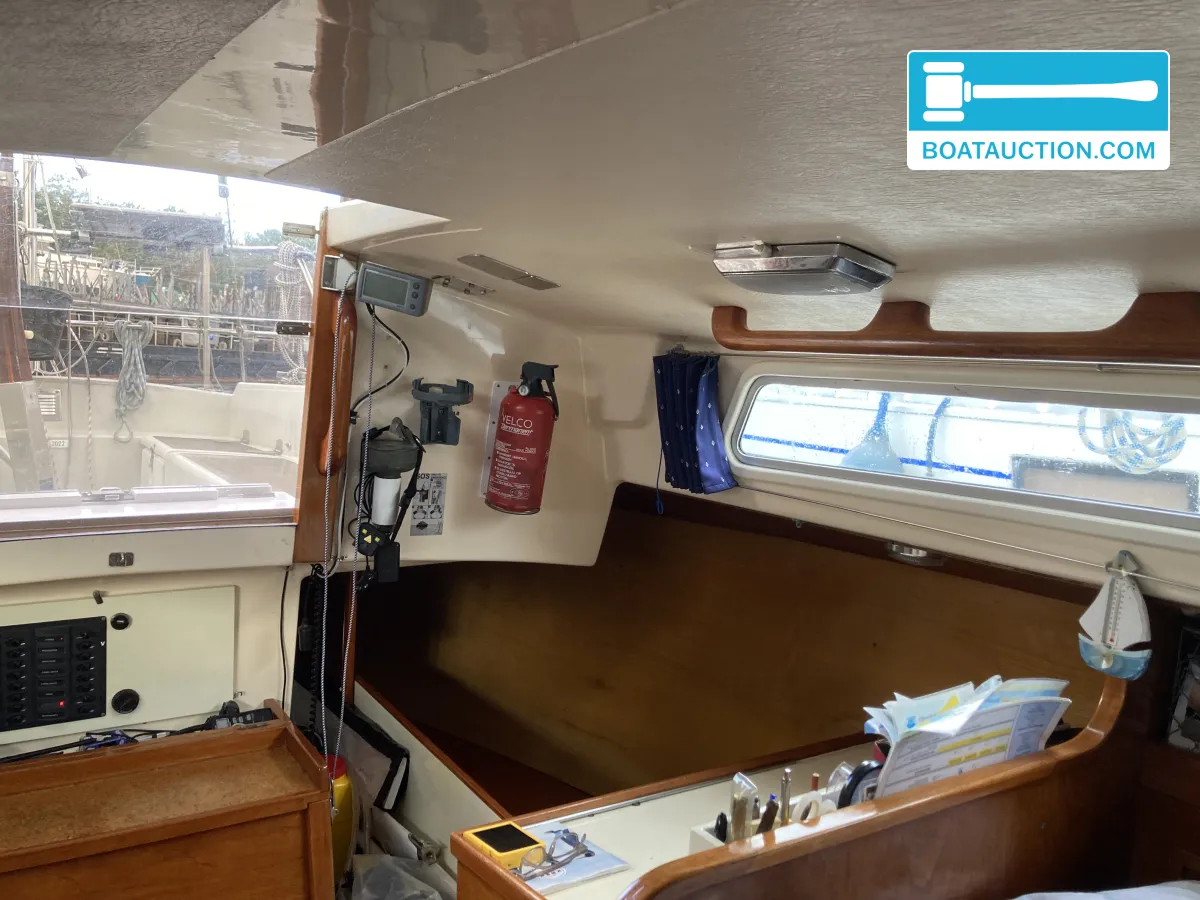 Navigatie en zeiluitrustingQua navigatie is de boot voorzien van een GPS, dieptemeter, kompas en een iCom handheld marifoon. De zeiluitrusting bestaat uit één aluminium mast en zes zeilen, waaronder een grootzeil, fok en genua. De genua 1 is recent vernieuwd, terwijl de overige zeilen in redelijke staat verkeren. Het grootzeil is gedeeltelijk doorgelat en voorzien van drie reven. De boot beschikt over een handmatige ankerlier en twee ankers met lijnbevestiging. Buitenom is de boot uitgerust met een buiskap, preek- en hekstoelen, stootwillen, lijnen, een zeerailing, een zwemplatform en een zwemtrap.