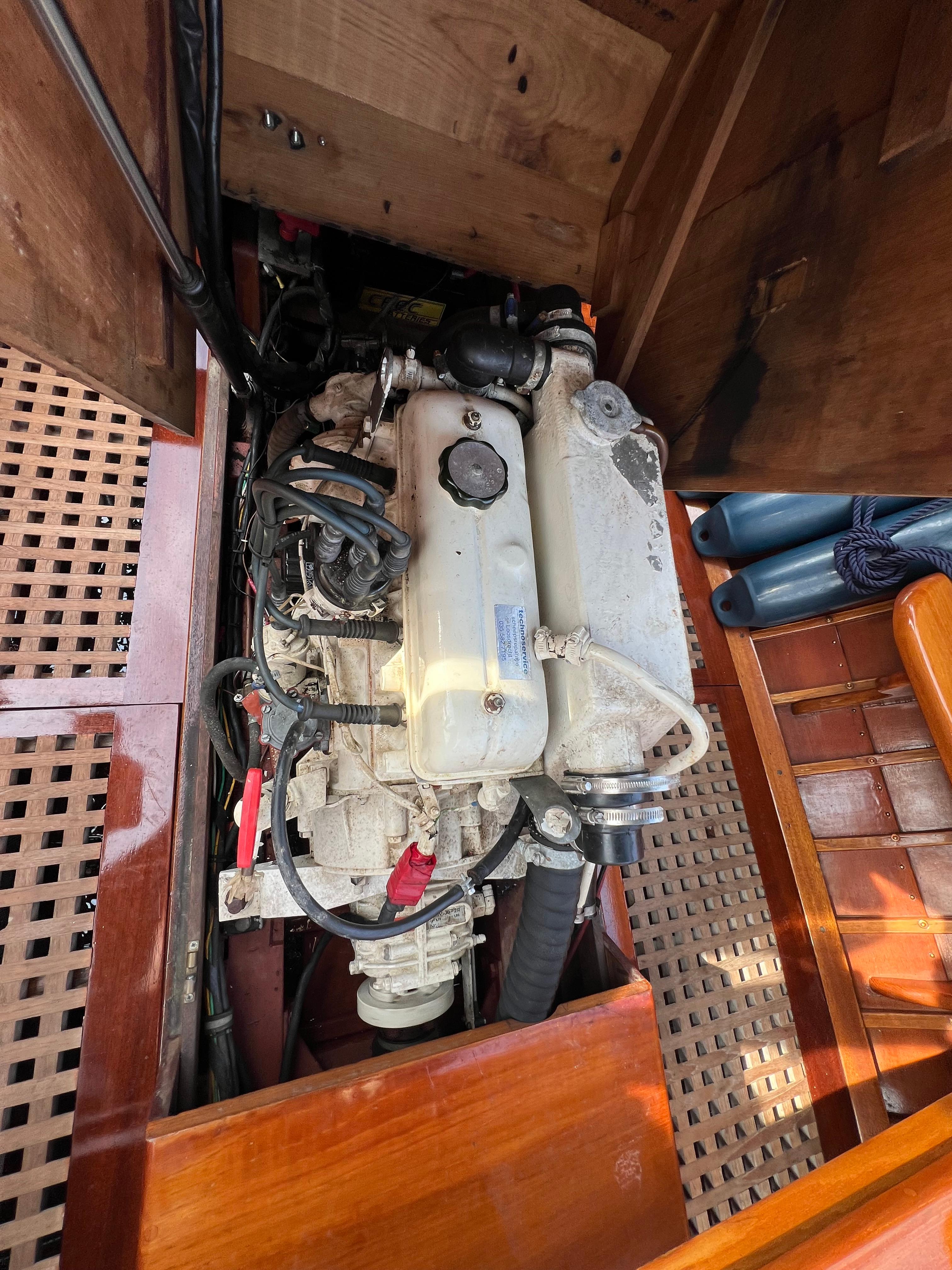 De motor heeft onlangs een flinke onderhoudsbeurt gehad en loopt als een zonnetje. Het betreft een DTR marine / by Volvo Penta. Hij is fluisterstil in vergelijk met diesel. Mede door de, voor deze specifieke vlet ontworpen en gemaakte "Gori" propeller, veel "sleepkracht" (sleepje 16M2-ten er achter...) en uitzonderlijk snel in z'n soort.