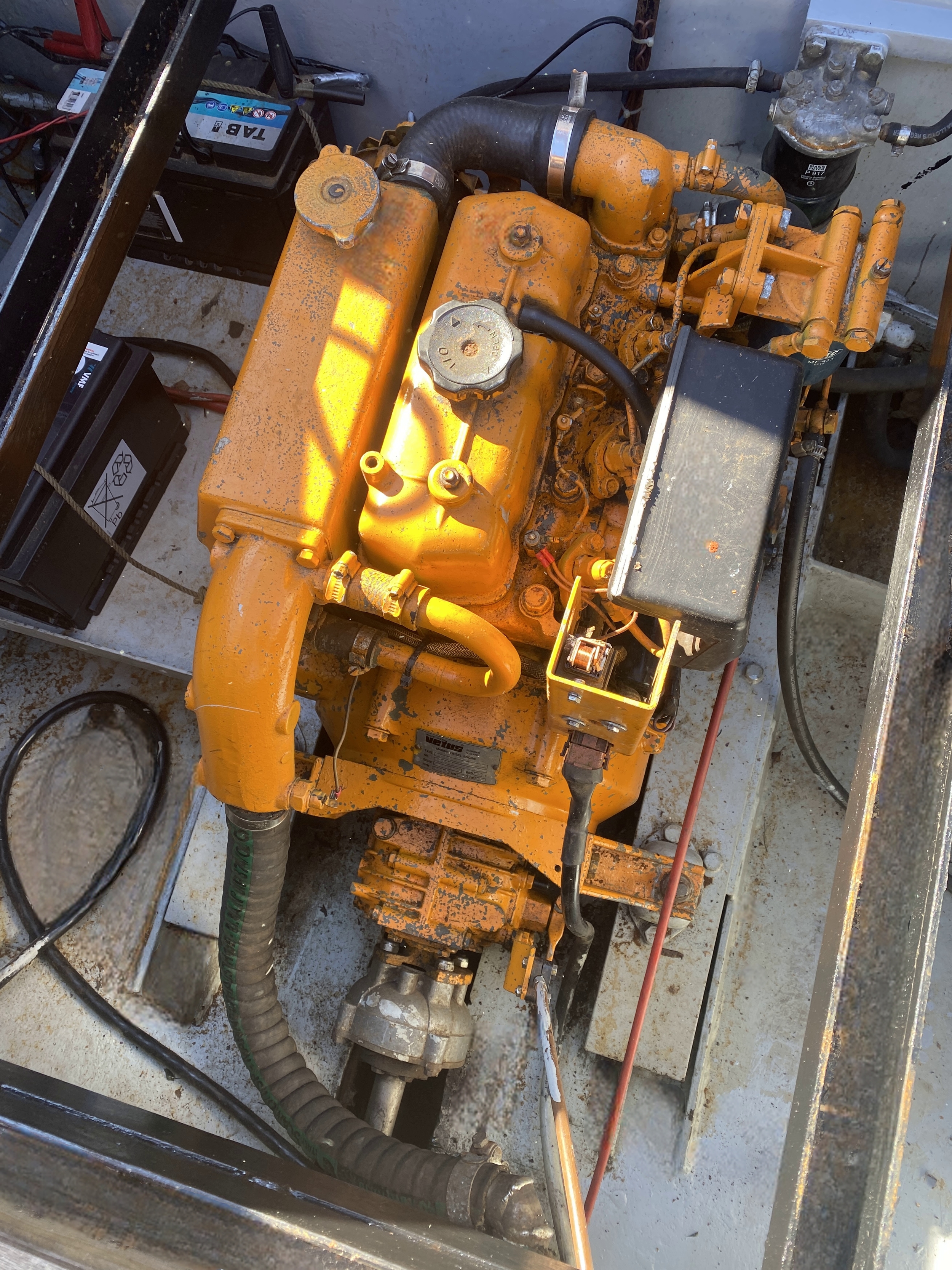 Nette, goed onderhouden Vetus driecilinder 21 pk in een eveneens goed onderhouden motorbun, overal goed bereikbaar.