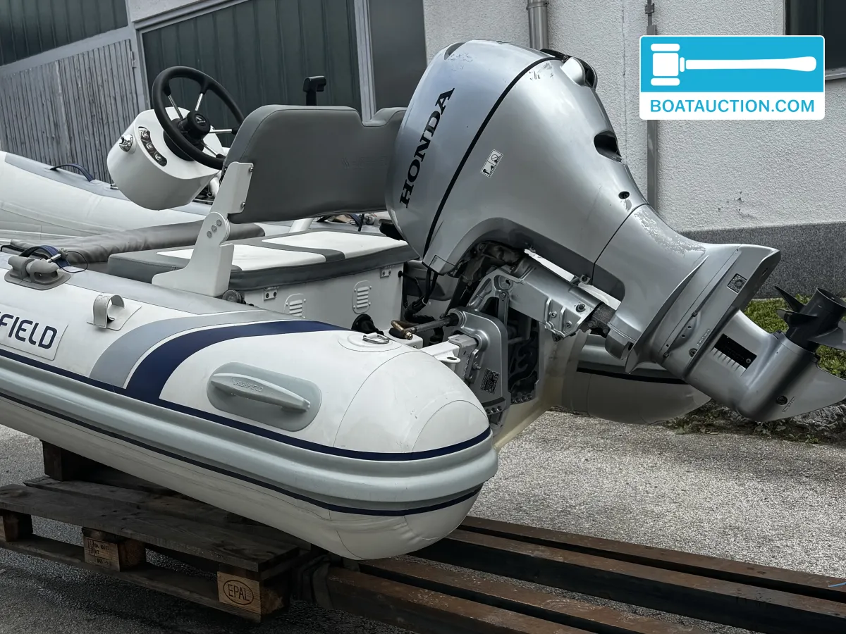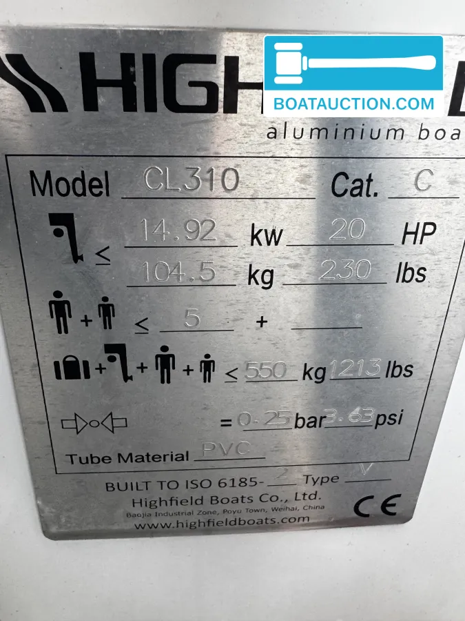 Highfield CL310 nu in de online veiling. Iedereen kan meebieden tot en met 24 november 2025.De Highfield CL310 is uitgerust met een Honda BF20 buitenboordmotor. Deze motor is eveneens uit 2020 en beschikt over een elektrisch startsysteem. De Honda BF20 levert een vermogen van 20 pk en is voorzien van twee cilinders. De motor draait op benzine en is operationeel. Deze configuratie biedt voldoende vermogen voor gebruik als tender of voor korte vaartochten op open water.
