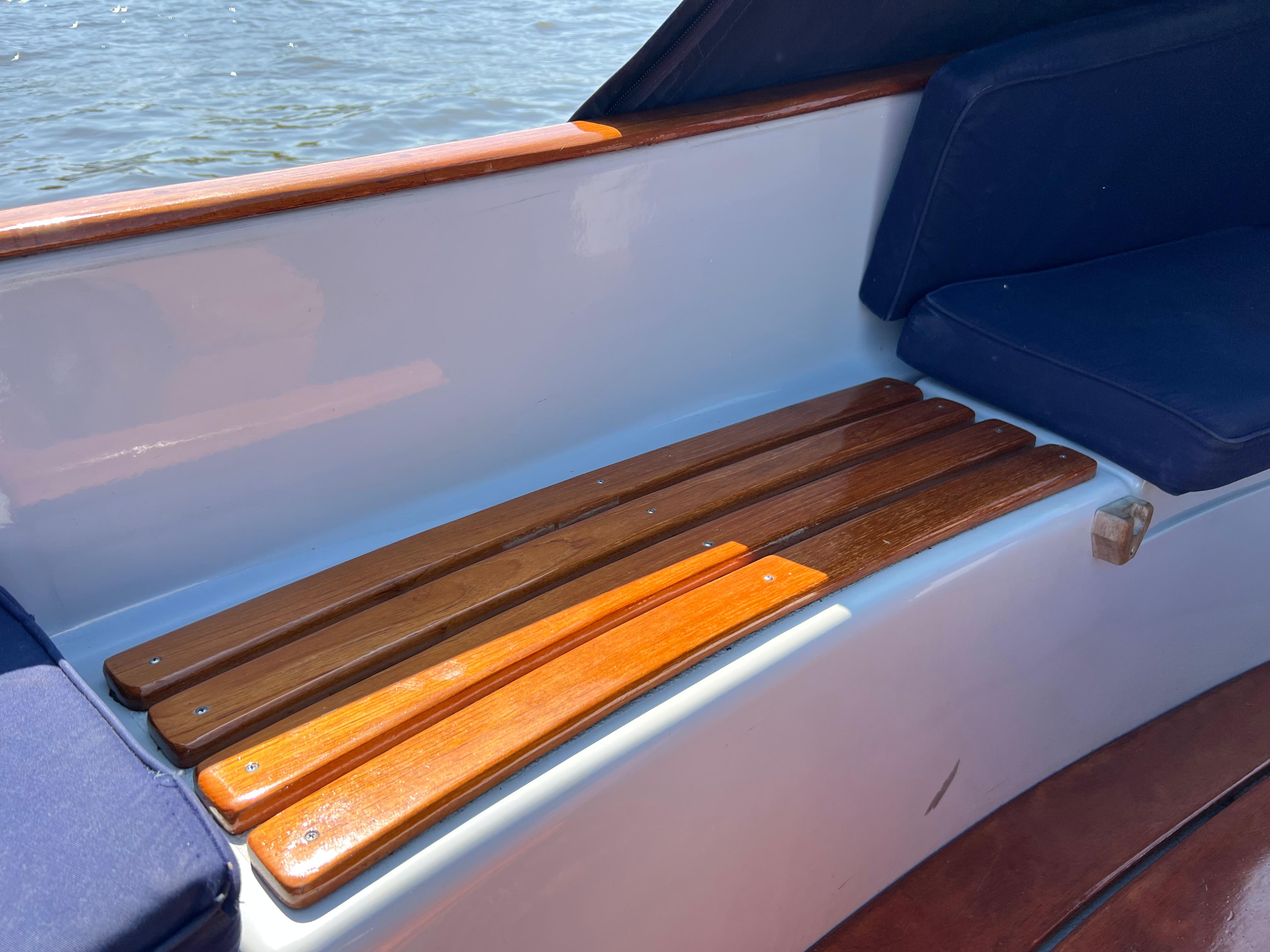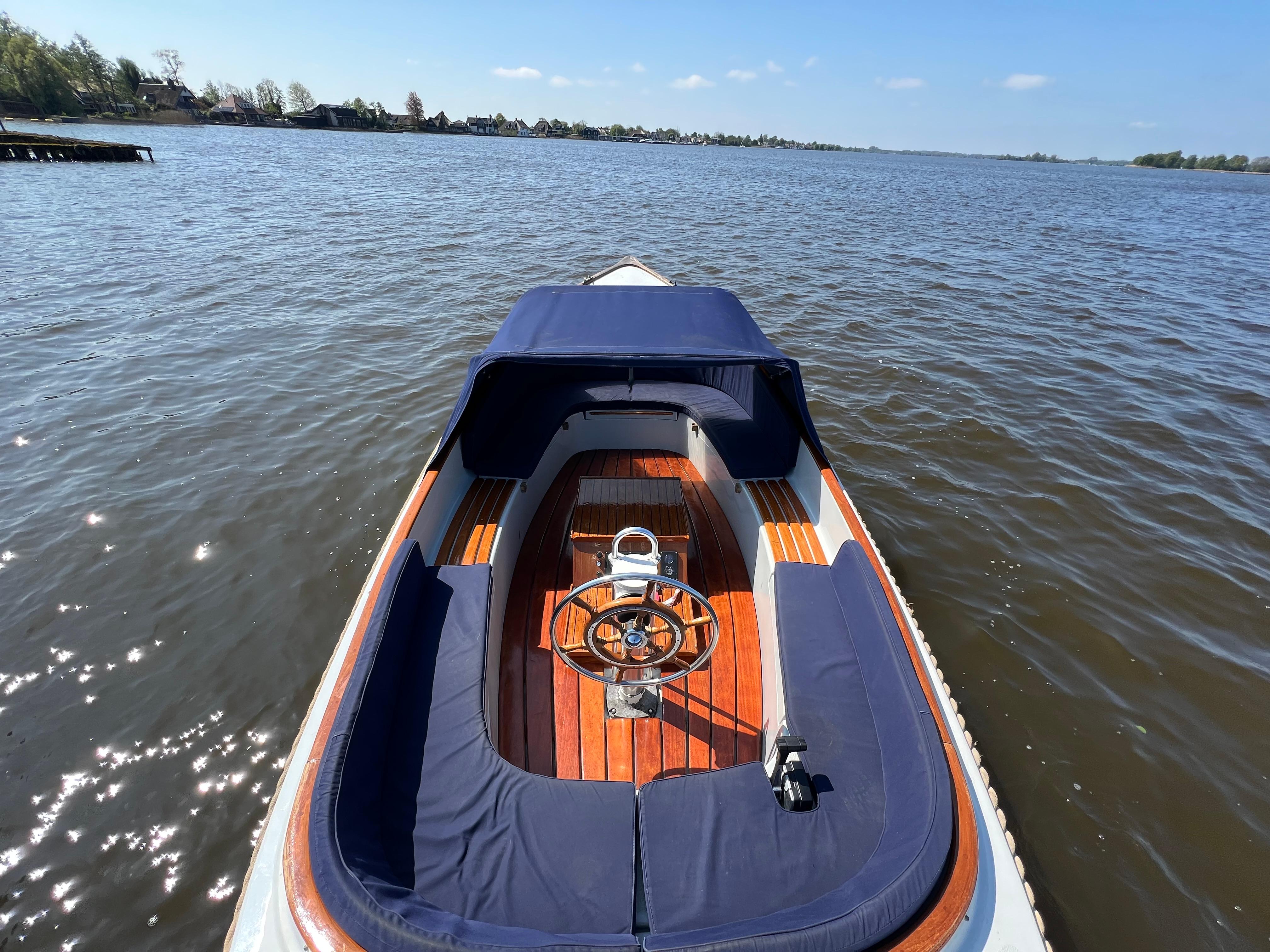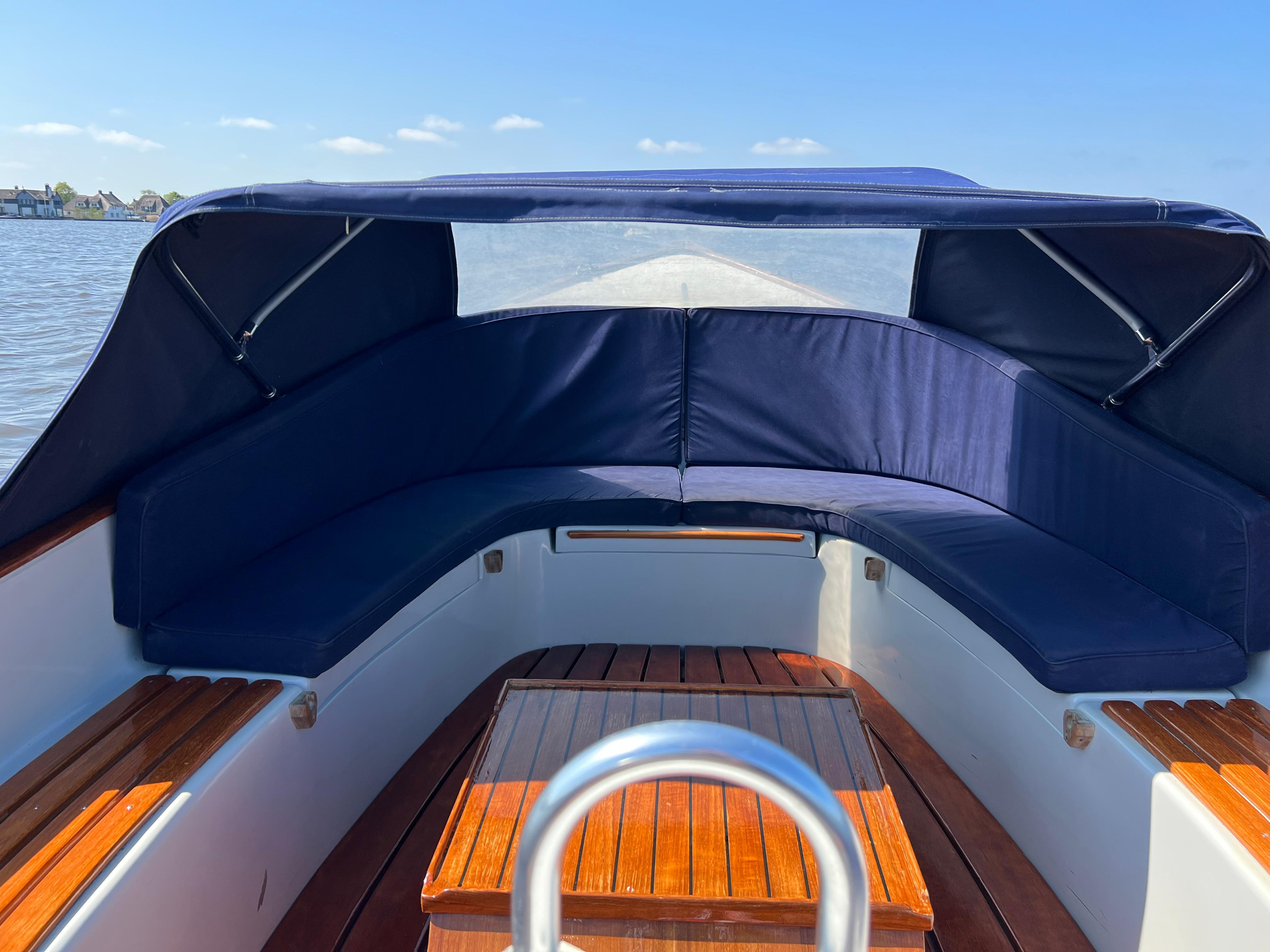 De boot is voorzien van een volledig afsluitbare buiskap, luxe kussenset, houten gelakte vlonder, veel opbergruimte en gelakte instapjes.