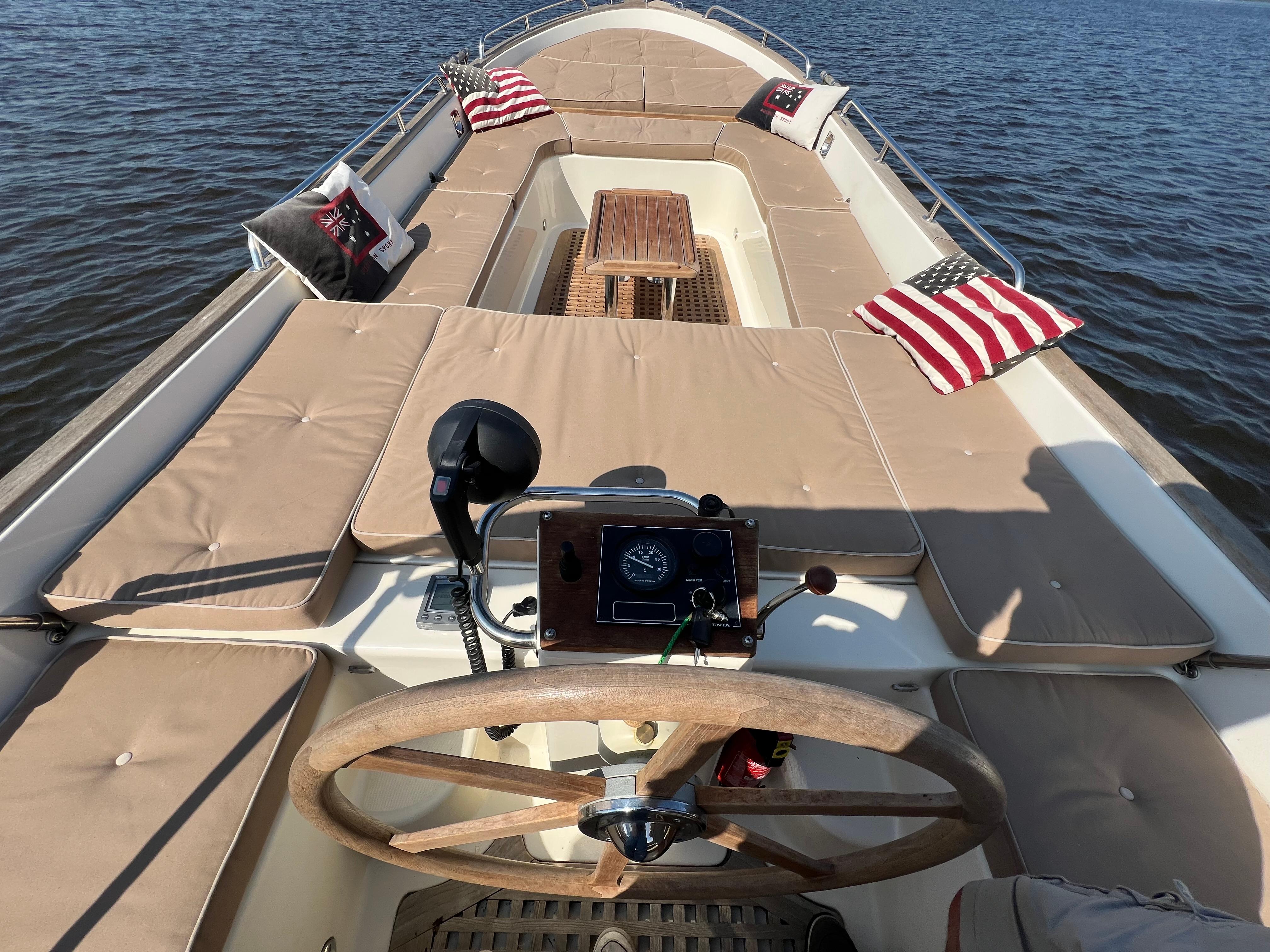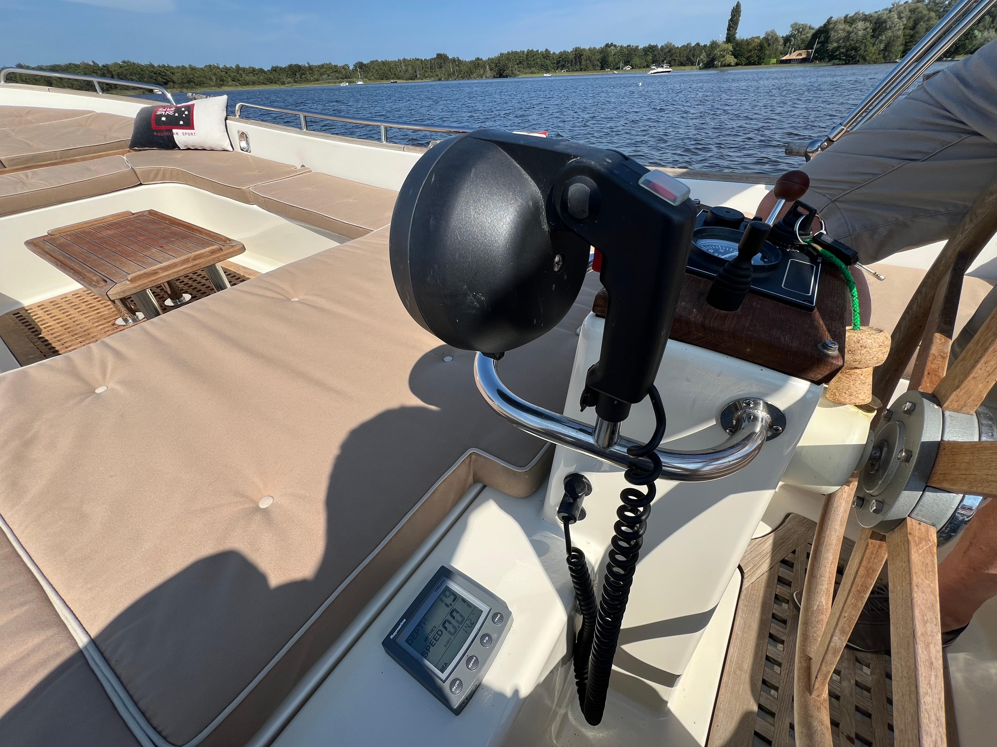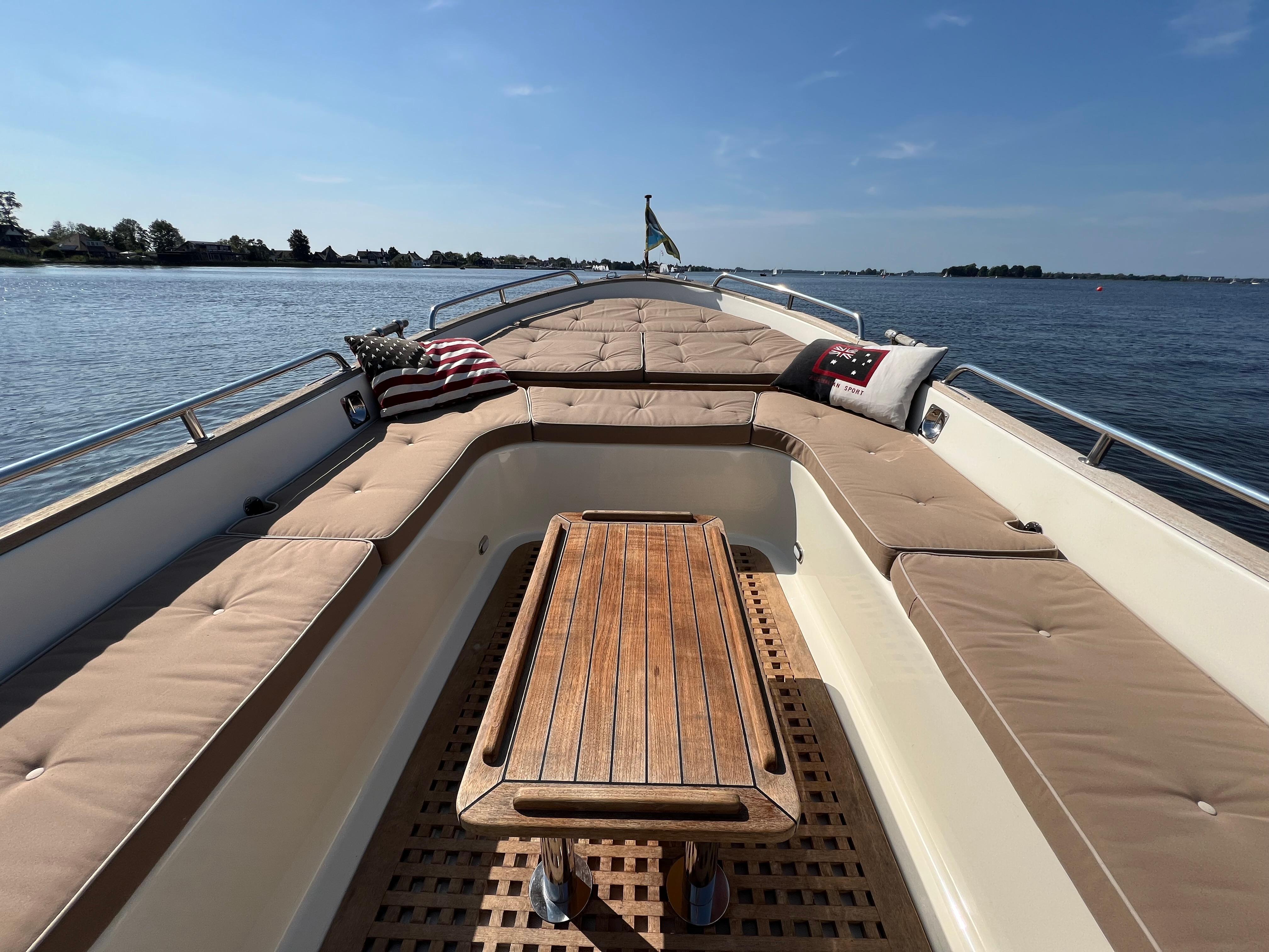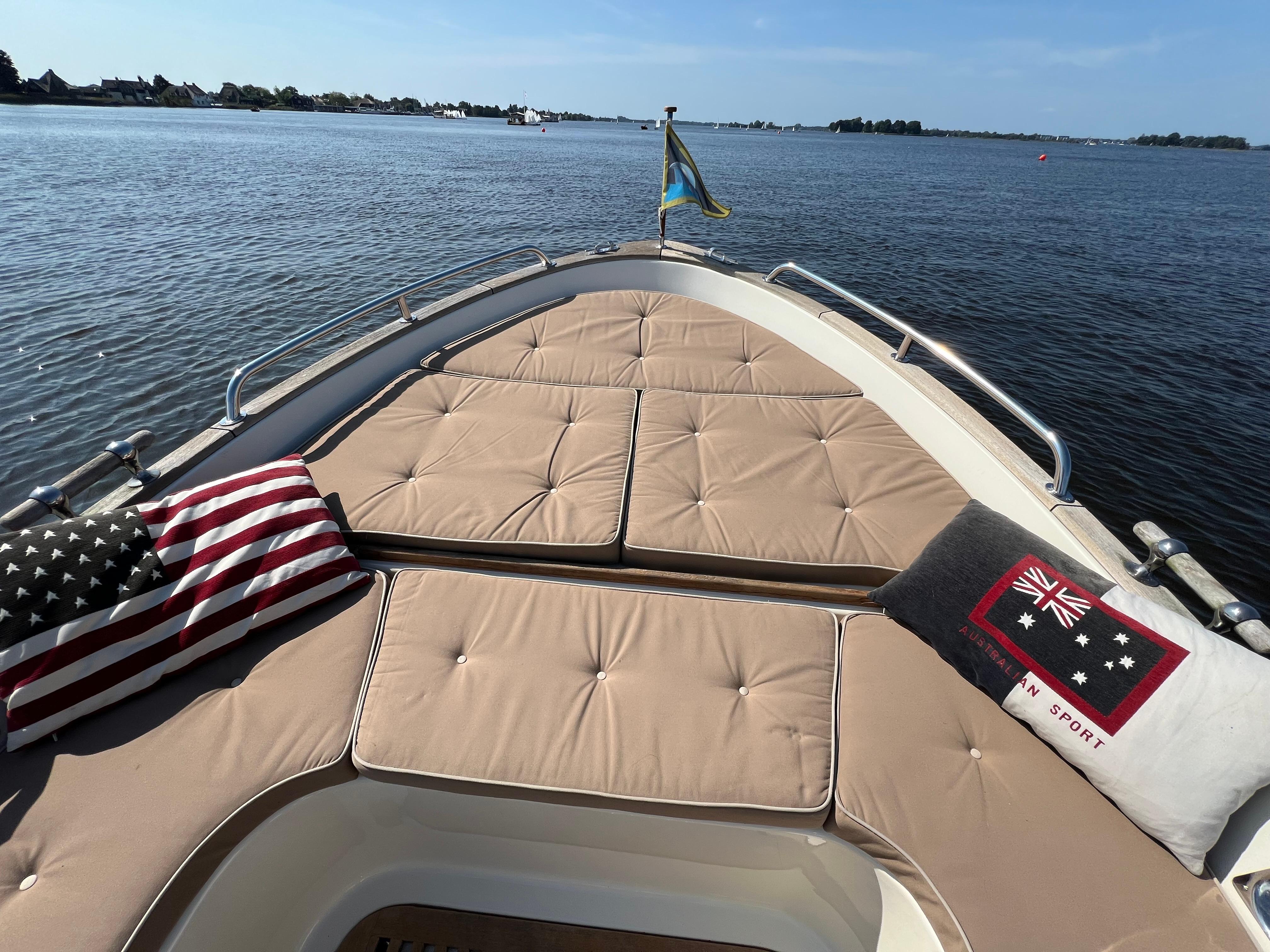 De sloep is voorzien van een luxe complete kussenset met zonnedek, buiskap, biminitop, boegschroef, koelkast, kuiptafel, zoeklicht, kuipverlichting en een Raymarine dieptemeter.