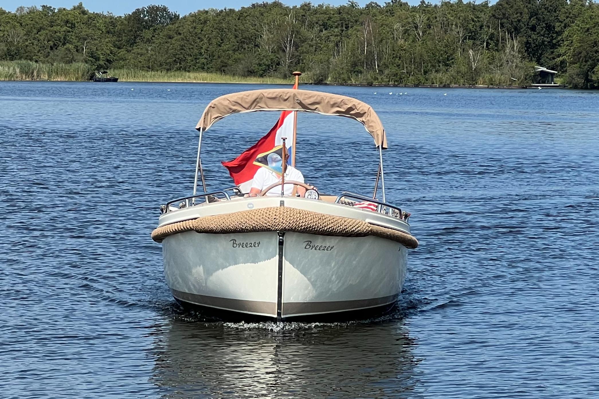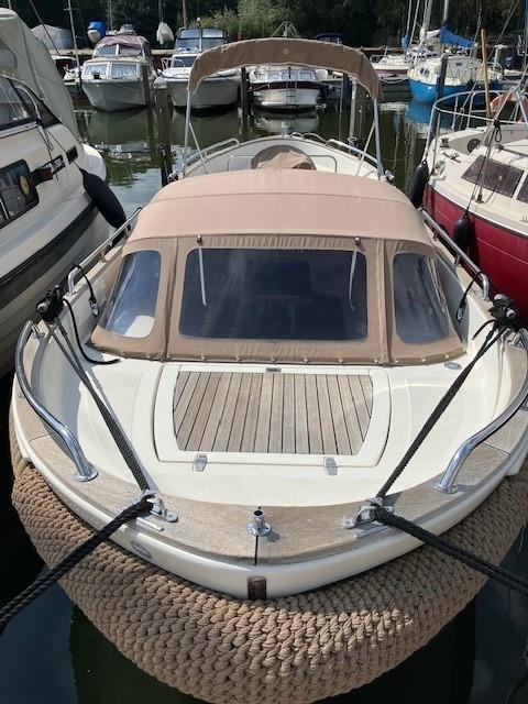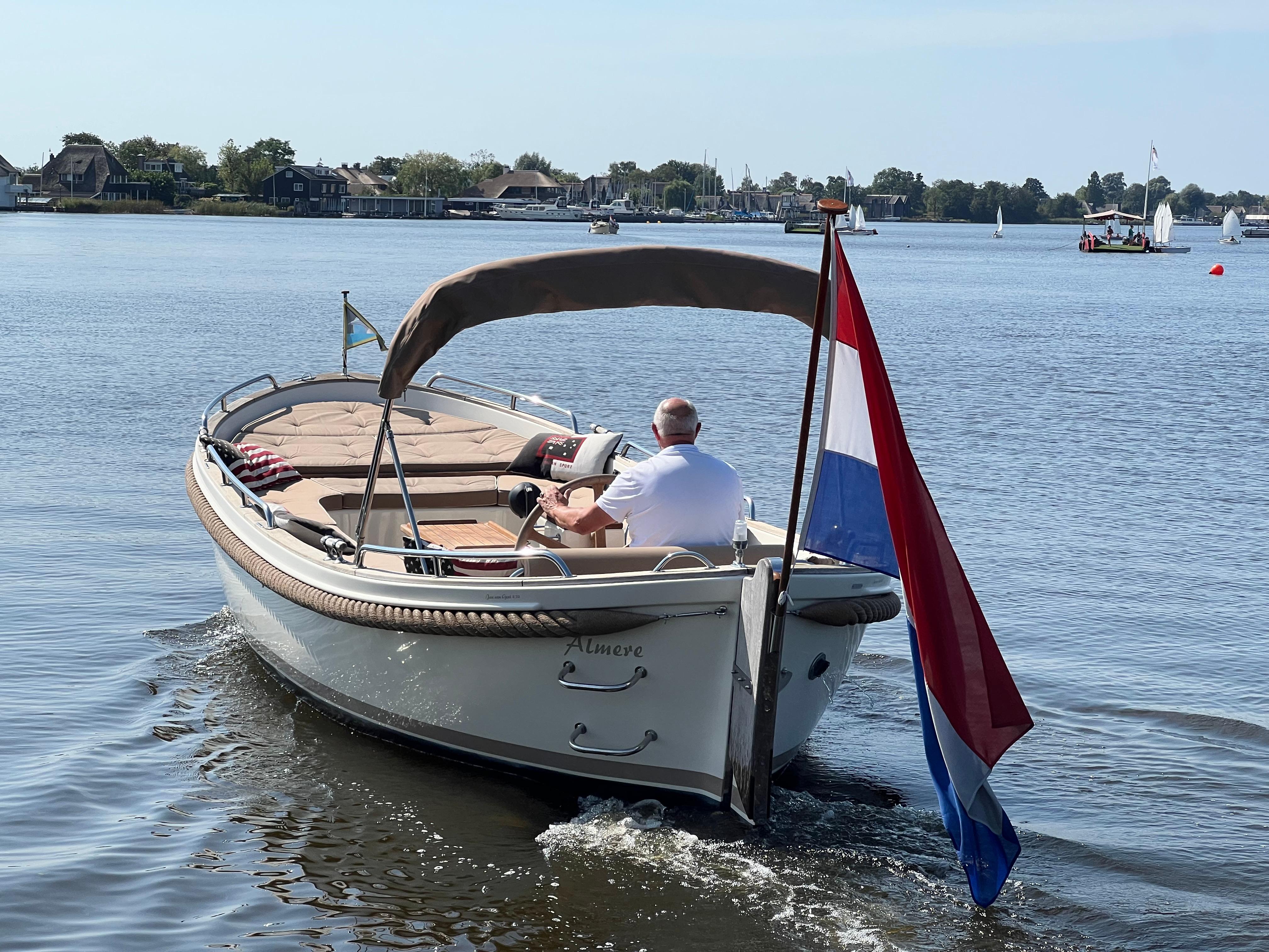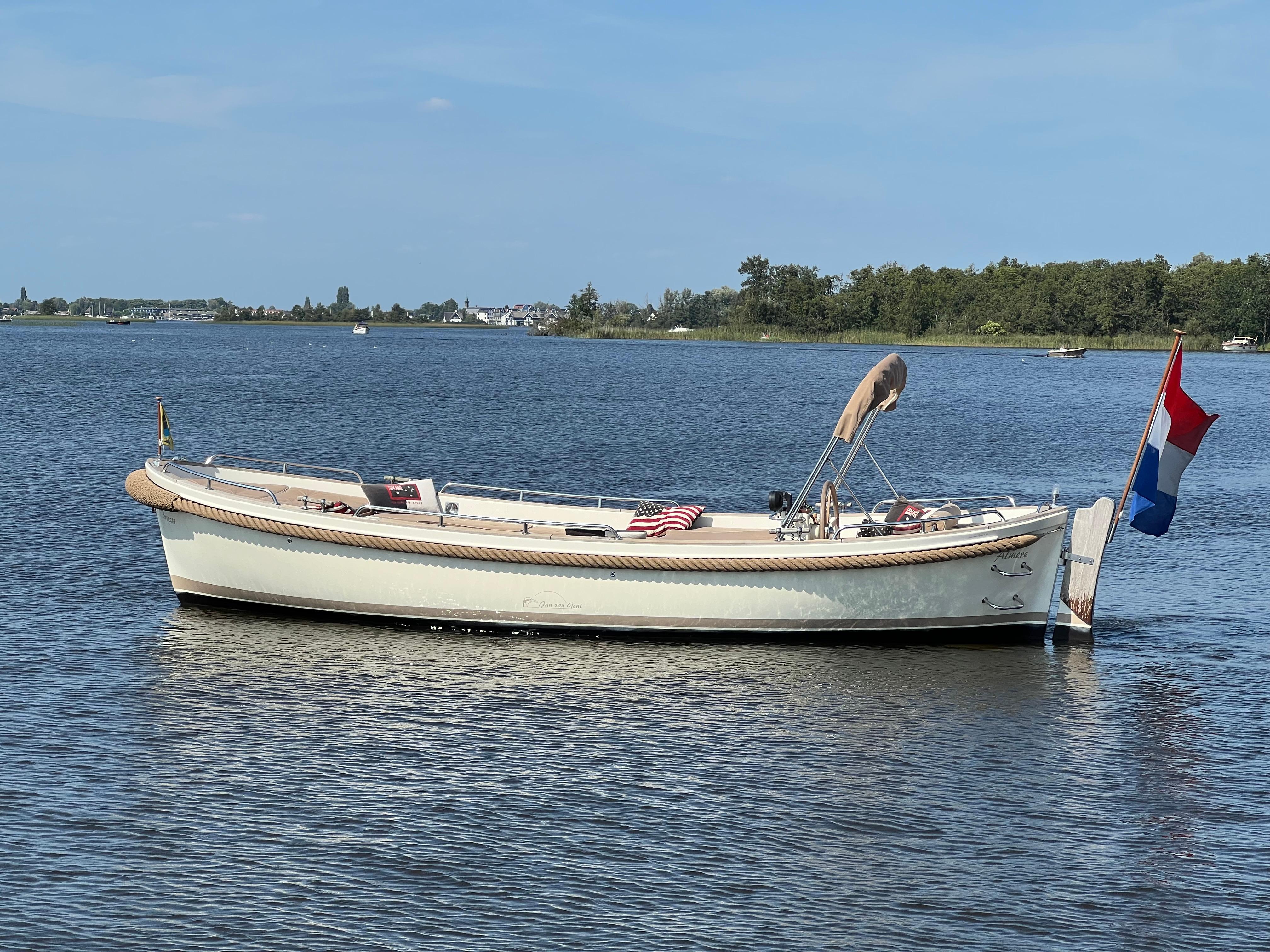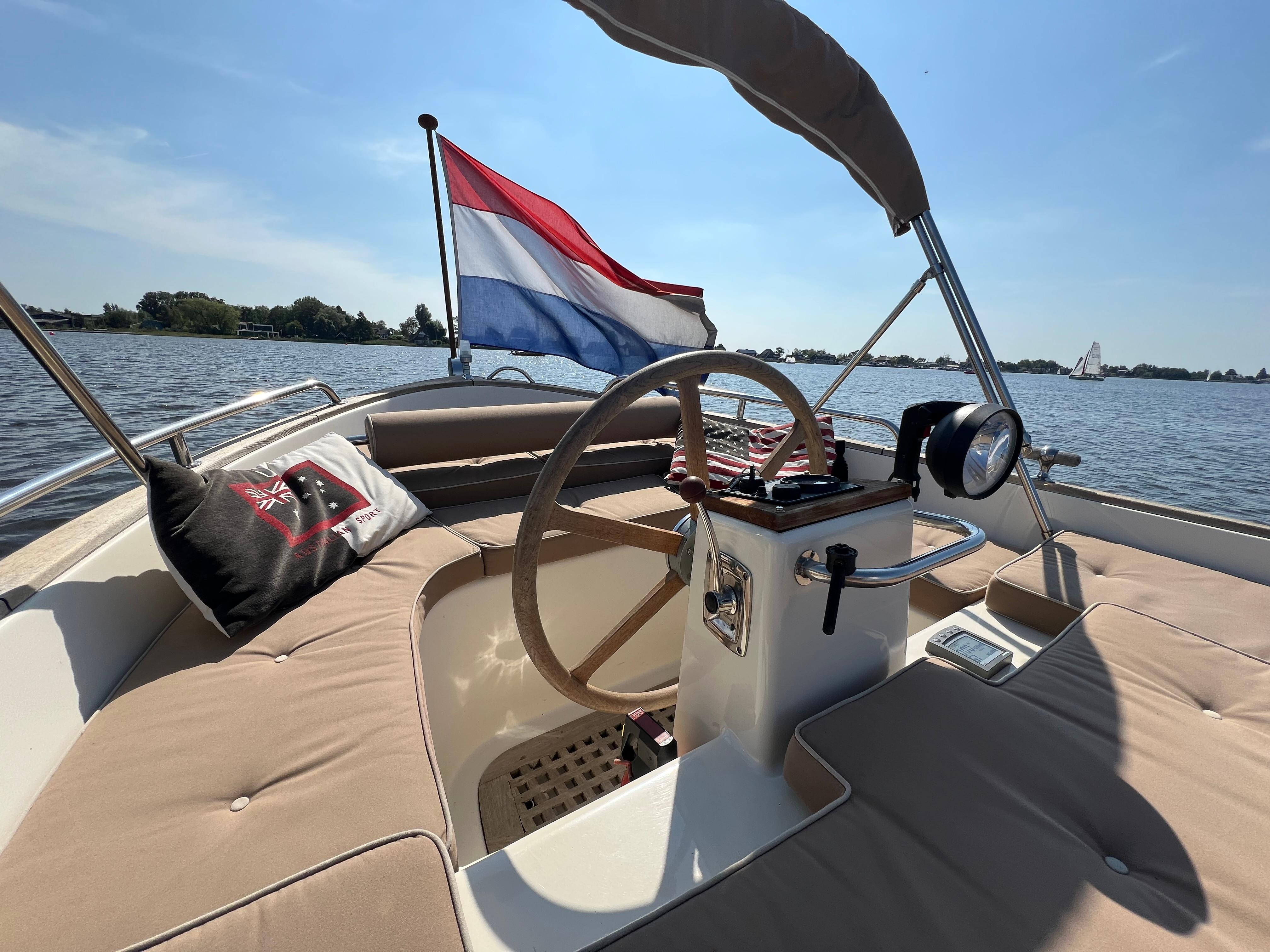 De sloep is voorzien van een luxe complete kussenset met zonnedek, buiskap, biminitop, boegschroef, koelkast, kuiptafel, zoeklicht, kuipverlichting en een Raymarine dieptemeter.