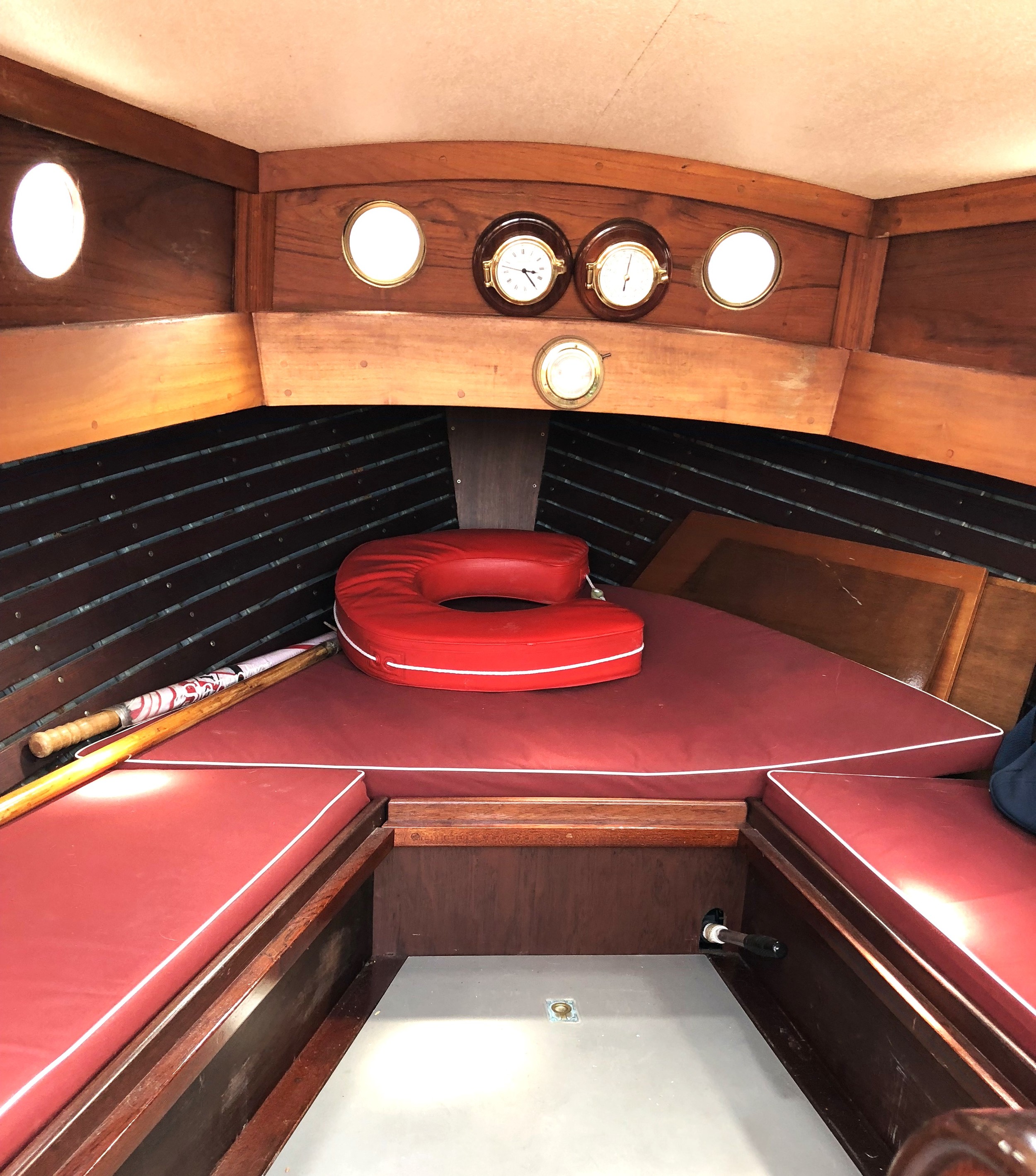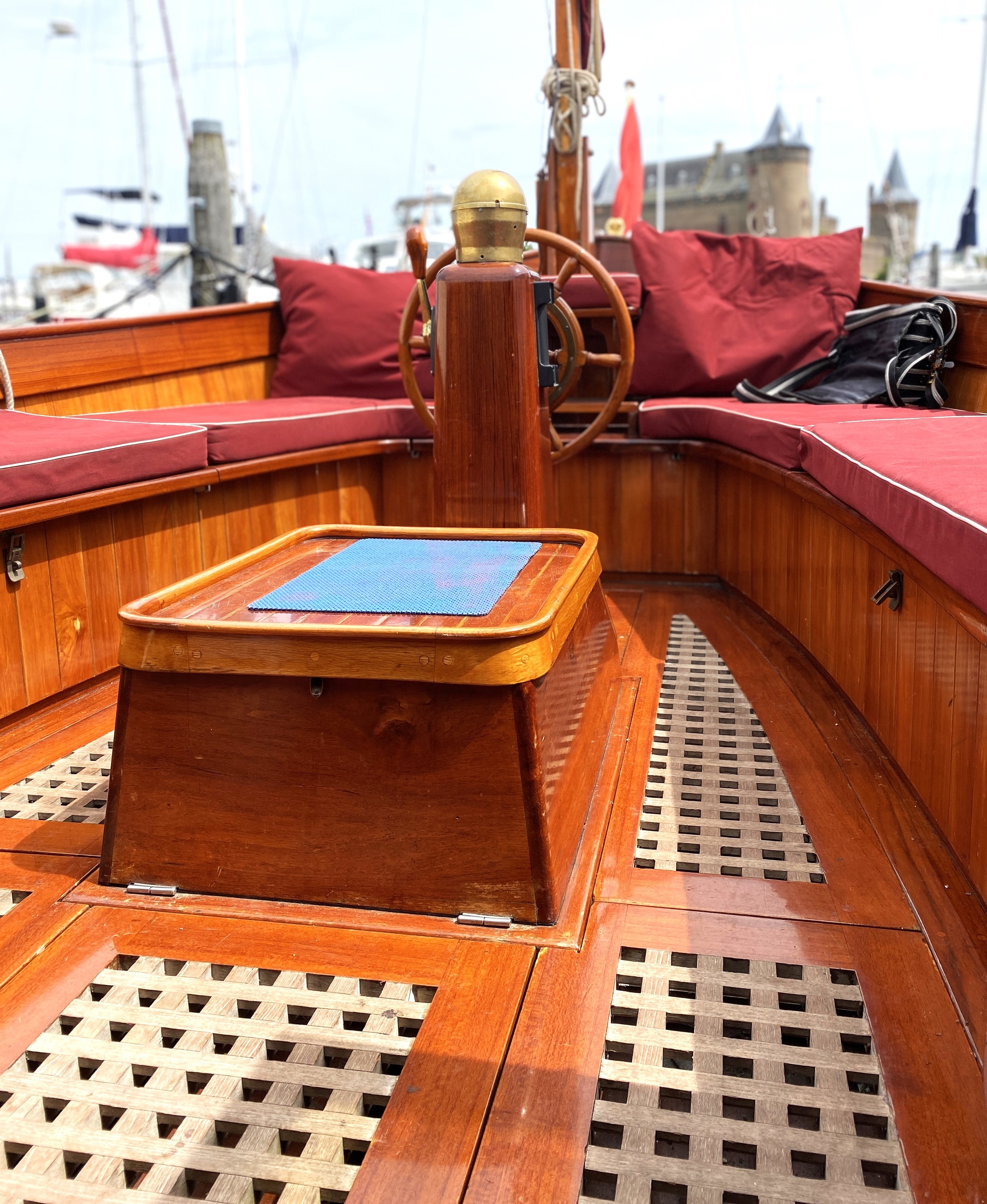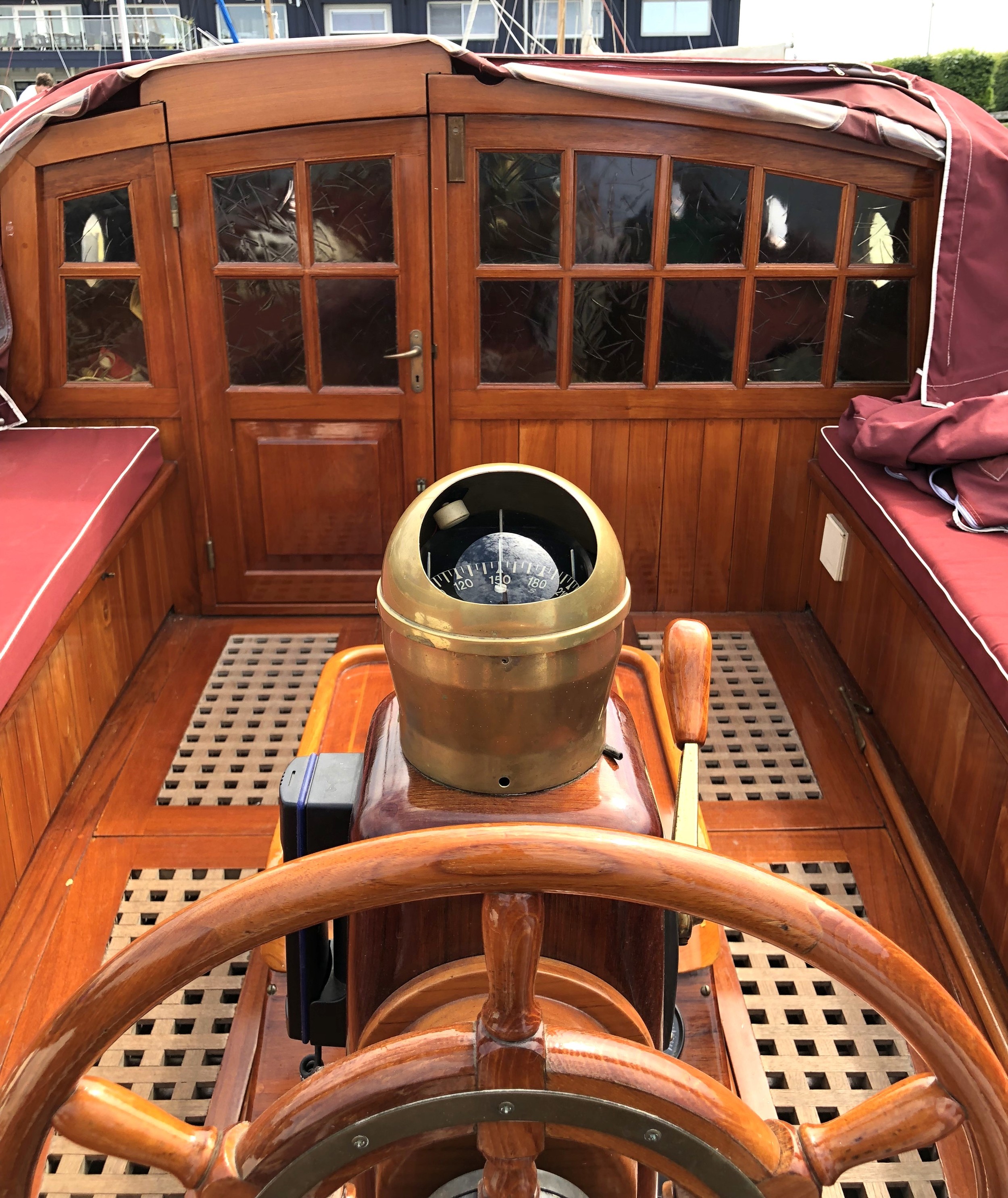 9 zitplaatsen buiten en 5 zitplaatsen binnen. De banken binnen zijn met een tussenstuk om te bouwen tot een ruim 2 persoons bed. Een fraaie en graag geziene verschijning op het water en te bezichtigen in Muiden.