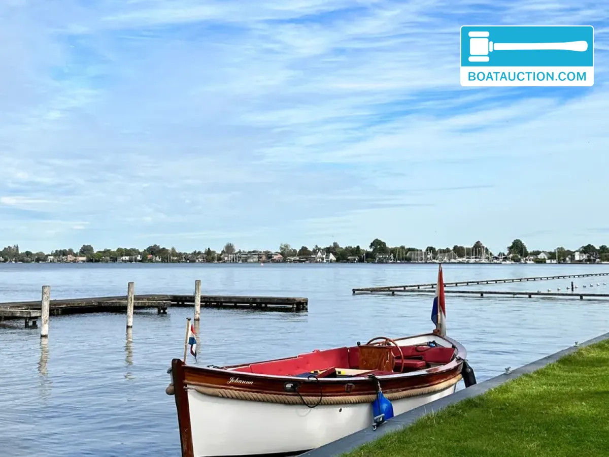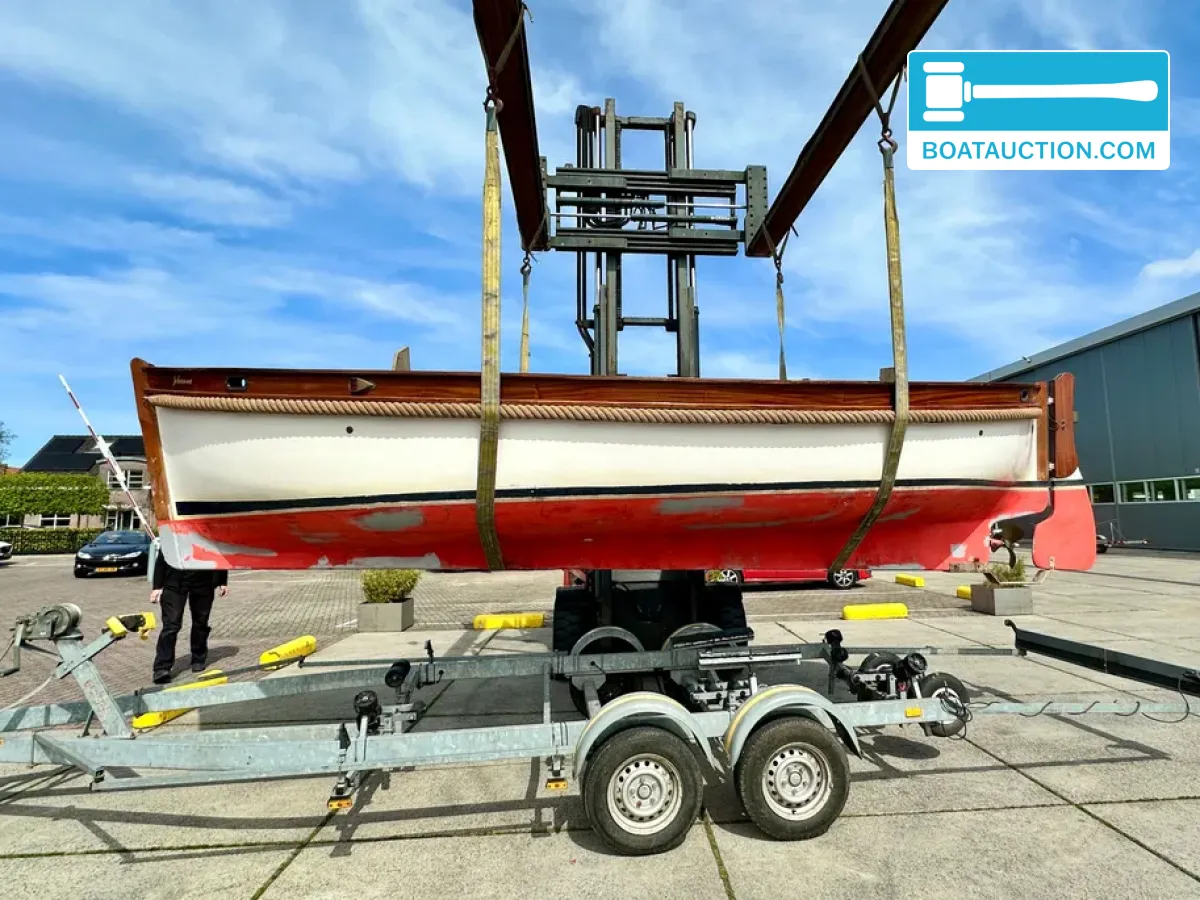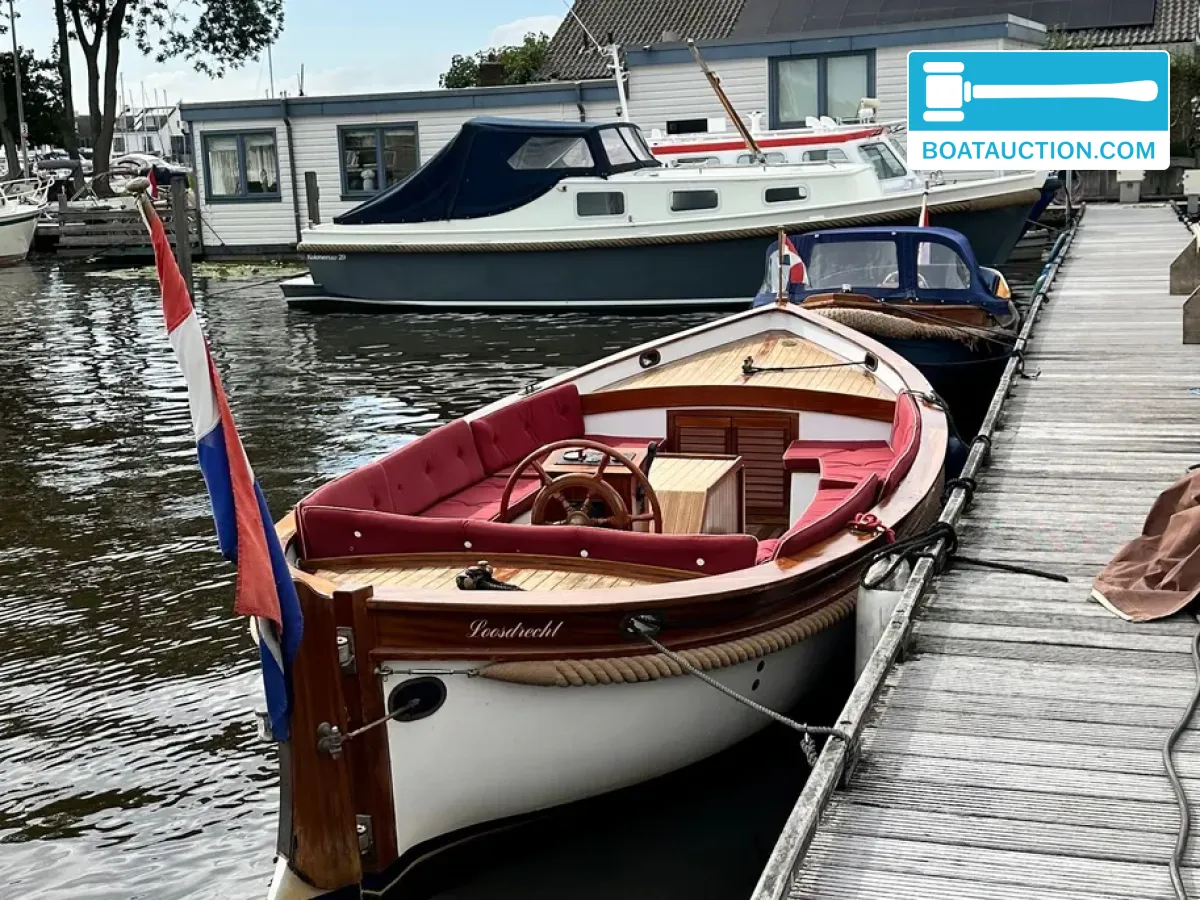 Constructie en uitrustingDe romp van de sloep is vervaardigd uit polyester, wat bijdraagt aan de duurzaamheid en het onderhoudsgemak. De afwerking met mahoniehout geeft de boot een klassieke uitstraling. Messing beslag en verzonken kikkers versterken het traditionele karakter van het vaartuig. De kuip is voorzien van originele kussens. Zowel voor- als achterin is er ruime opbergruimte beschikbaar.