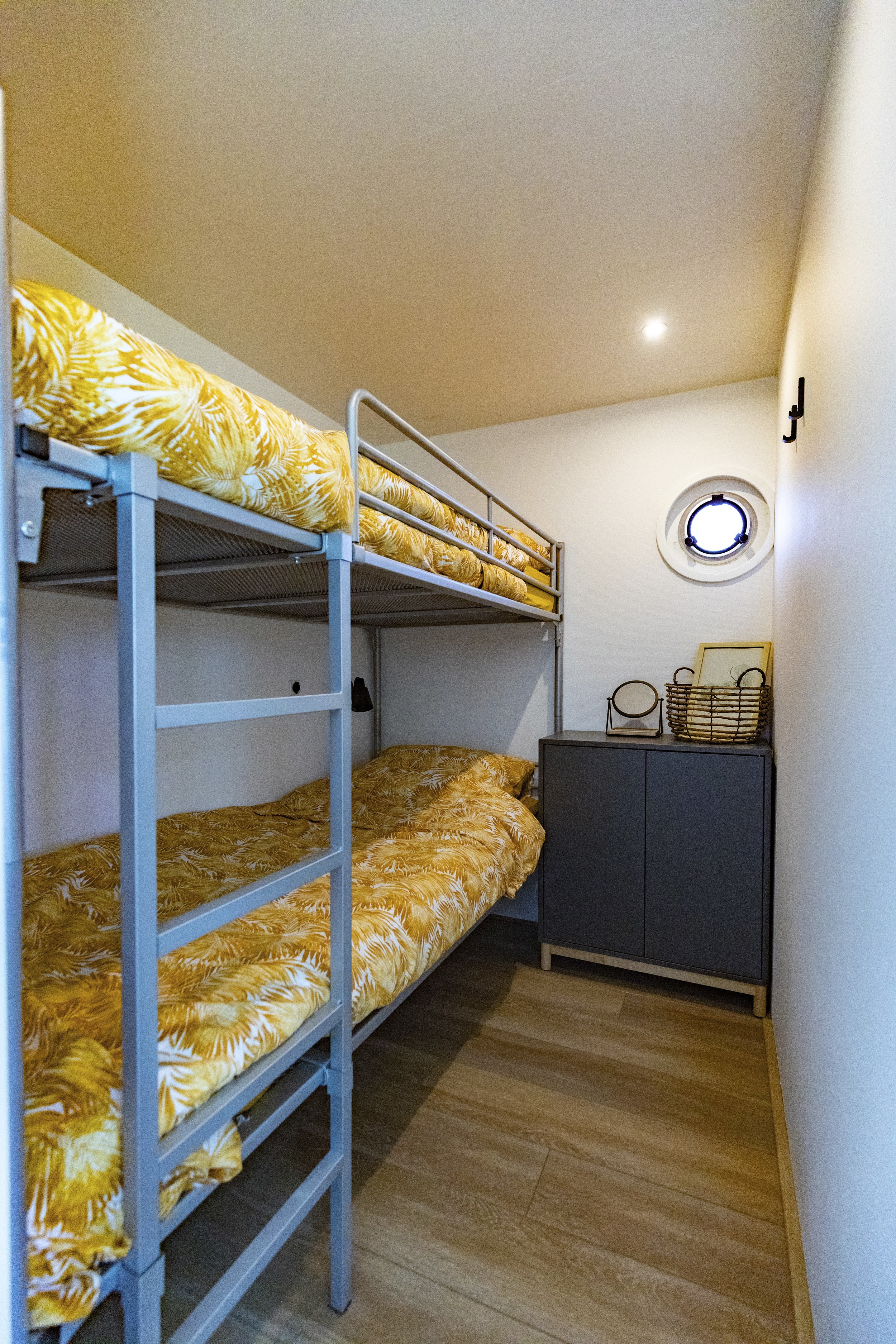 Vanuit de living naar de achterkant van de boot komt u in een gang met een badkamer met douche en een aparte toiletruimte. Er zijn drie slaapkamers. 2 slaapkamers met stapelbedden en achterin een grote slaapkamer (masterbedroom) met veel raampartijen en een schuifpui naar buiten en naar het boventerras. Het boventerras is via een sterkte, zeer luxe, beschermde, ingebouwde trap te bereiken. Totale ruimte van terrassen voor, achter en boven bedraagt meer dan 16 m2. Zie de plattegrond bij de foto's. Uitstekend ingericht en geschikt voor de verhuur!