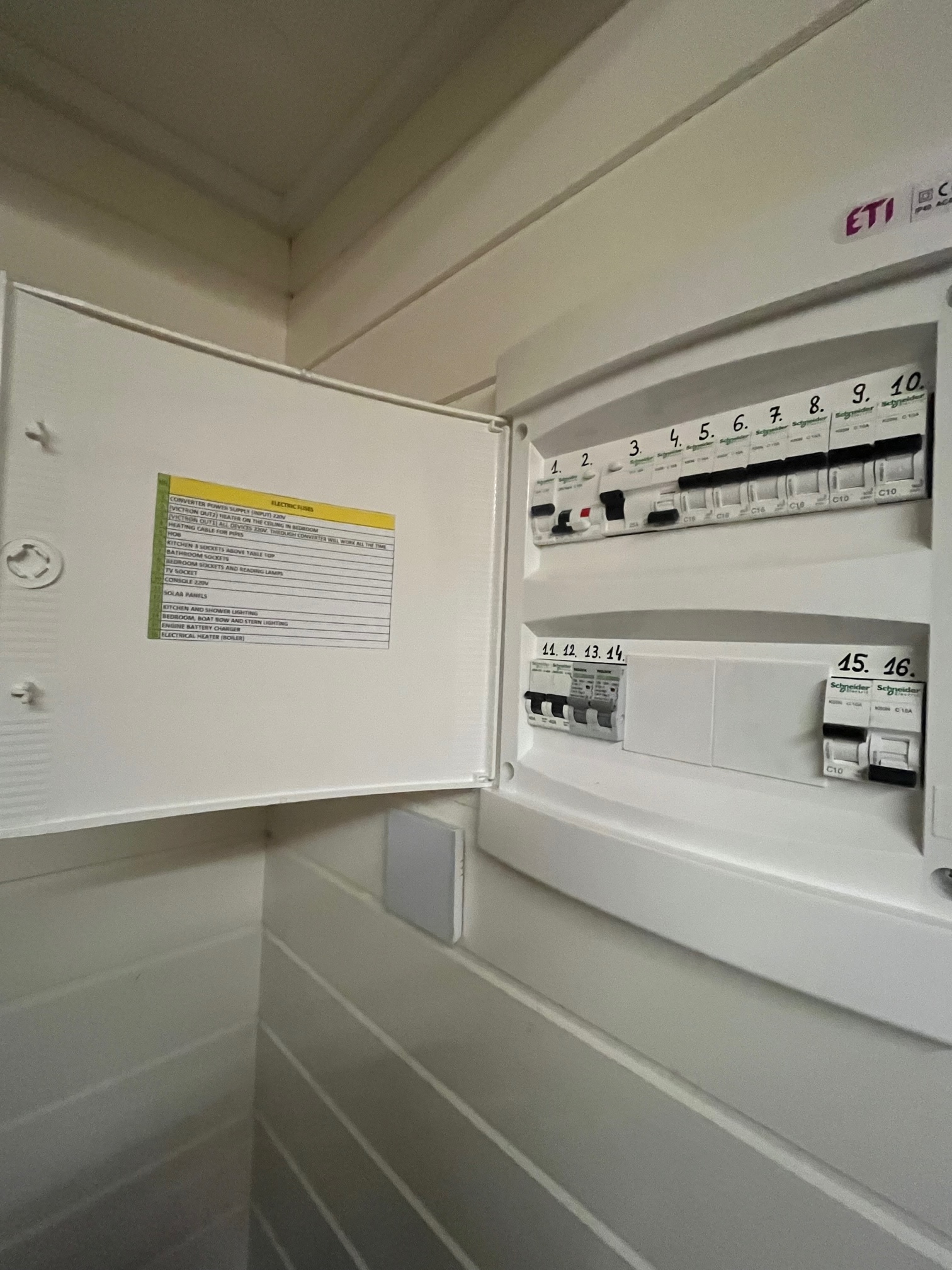 Elektrische installatie: LED-verlichting met standaard dimmers, in de woonmodule en op het achterdek, schakelaars, bedlampjes bij het bed, waterdichte 230 volt walaansluiting, 230 volt stopcontacten, een set elektrische zekeringen en een aardlekschakelaar, elektrische bedrading voor 230 volt en 12-24 volt en standaard RVS victron walaansluiting (16A/250VAC 2P/3W)