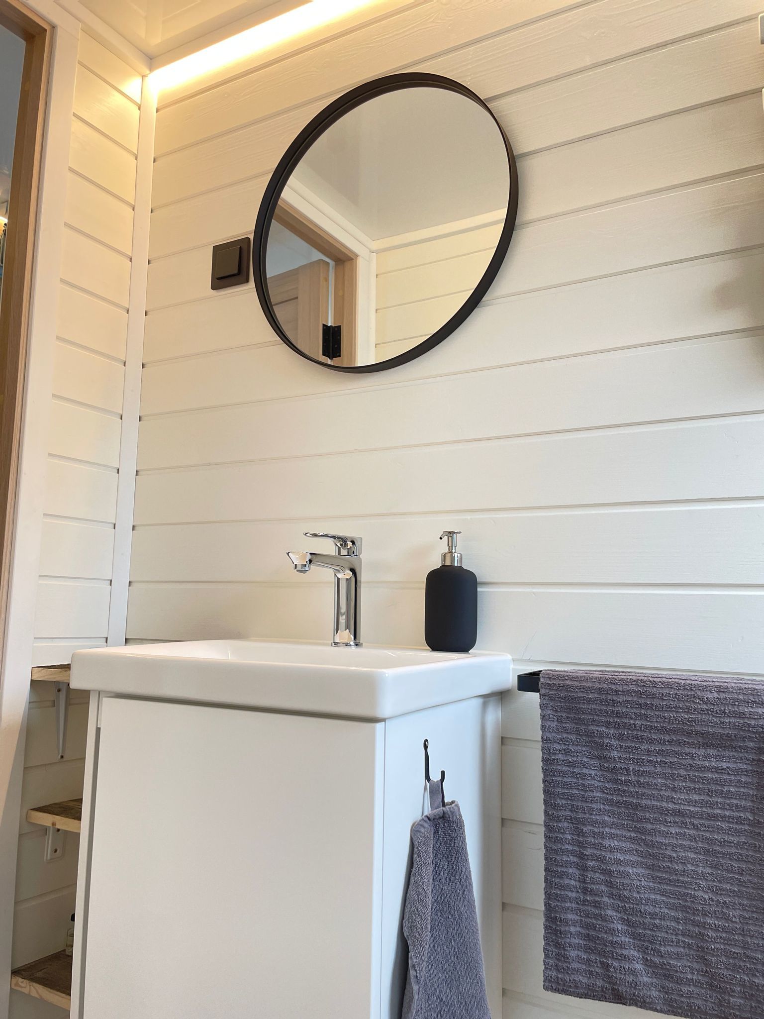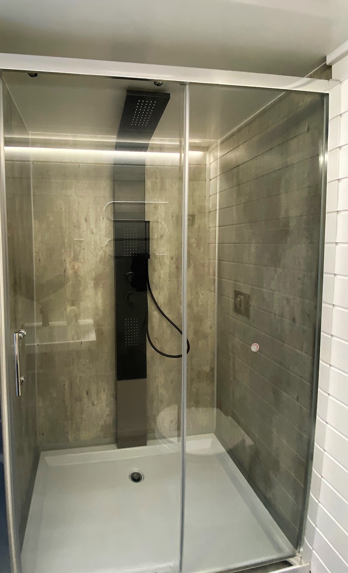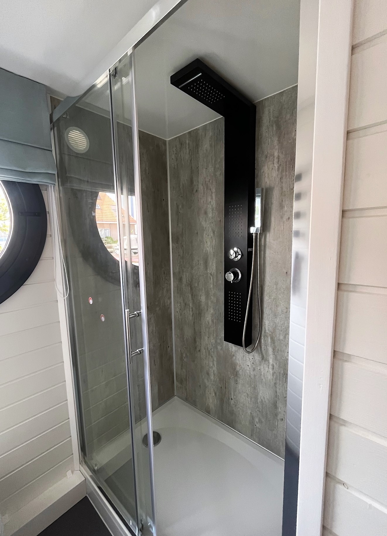 Uitrusting badkamer: warm en koud water, douchepaneel, wastafel met spiegel, waterafvoer in roestvrij staal, mengkraan, elektrisch toilet met vermaler en elektrische handoekverwarming.