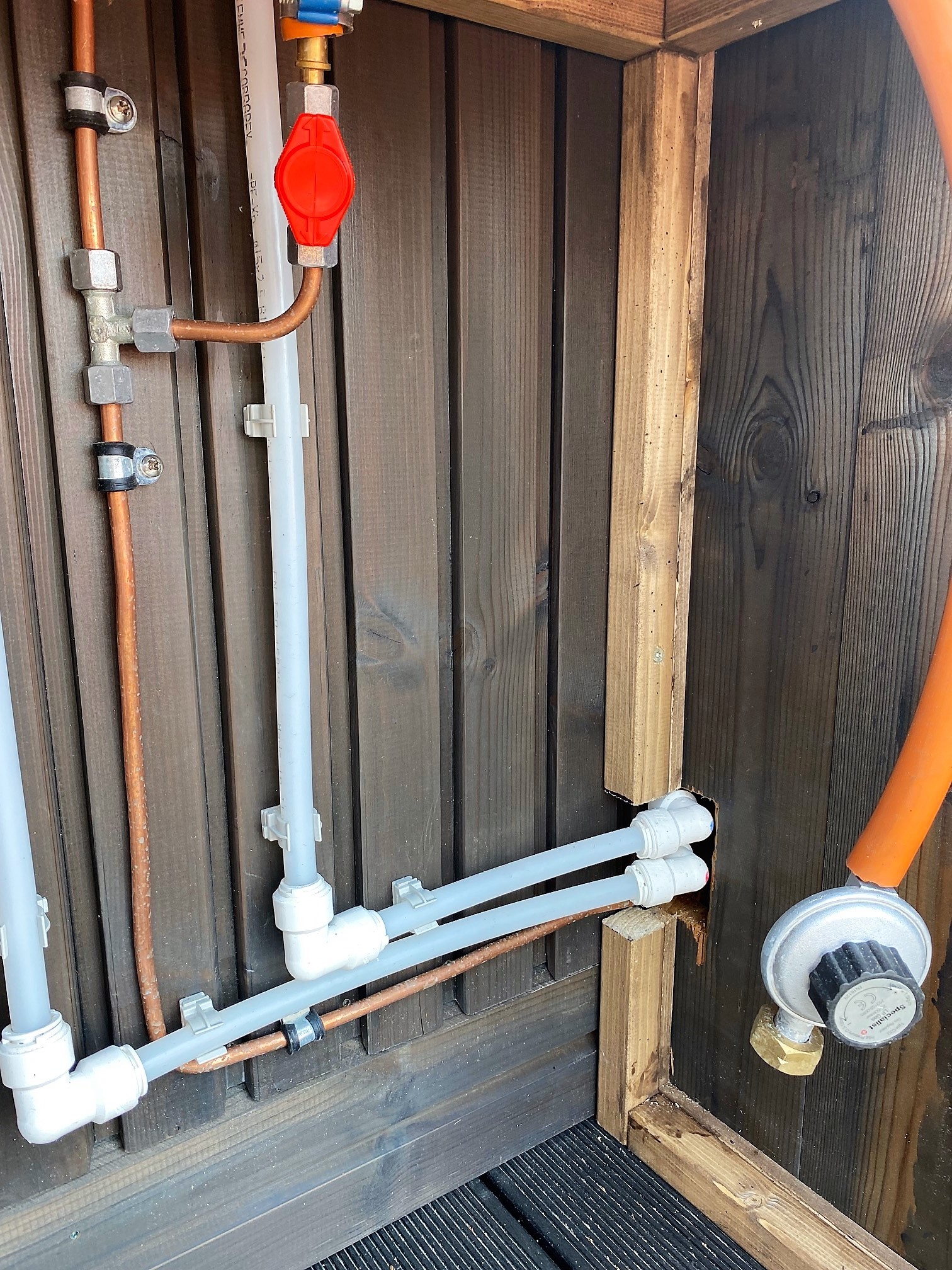 Buitenkasten aan de achterkant: service kolom voor vullen en aftappen; kast voor gasflessen.