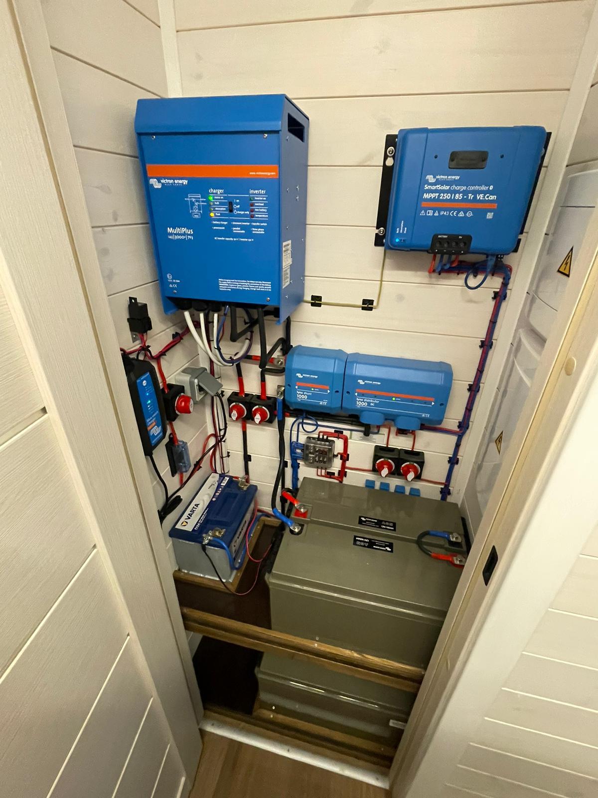 MAXIMUM + CERBO GX (6-8 days or more out of port, depending on weather conditions and solar intensity, and using standard/base electrical equipment). VICTRON ENERGY equipment: INVERTER MULTIPLUS 24/3000/70-50 , CERBO GX, GX Touch 70, GX LTE 4G-E, 12V/165Ah AGM deep cycle batteries (M8) 6 pcs, LYNX DYSTRYBUTOR, LYNX Shunt VE.Can, Baterry BALANCER, Solar panels 24V 360W Mono series 4a 6 pcs,SmartSolar MPPT 250/85-Tr VE.Can, Battery switches ON/OFF 275A, MEGA-fuses, Orion IP67 24/12-20 (240W) DC-DC converter, Orion-Tr 24/24-17A (400W) Isolated DC-DC converter, SHORE power cord 25 m 16A/250VAC (3X2, 5SQMM), POWER INLET STAINLESS WITH COVER 16A/250VAC (2P/3W), wires, connectors, installation work.