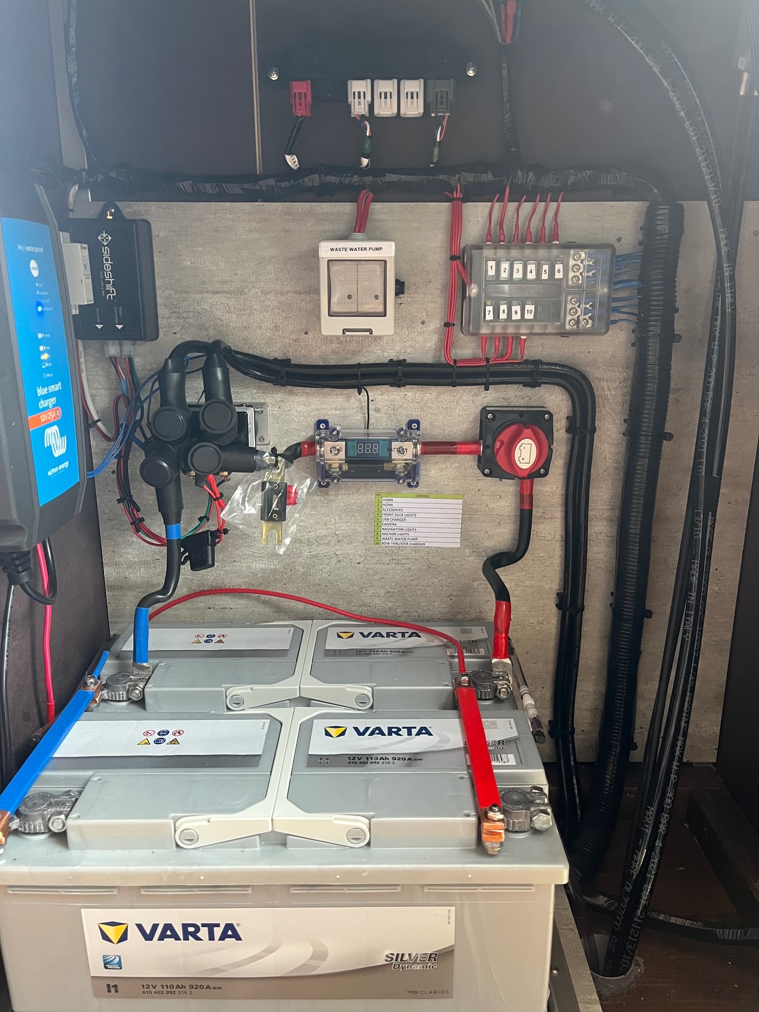 Elektrische installatie: LED-verlichting met standaard dimmers, in de woonmodule en op het achterdek, schakelaars, bedlampjes bij het bed, waterdichte 230 volt walaansluiting, 230 volt stopcontacten, een set elektrische zekeringen en een aardlekschakelaar, elektrische bedrading voor 230 volt en 12-24 volt en standaard RVS victron walaansluiting (16A/250VAC 2P/3W)