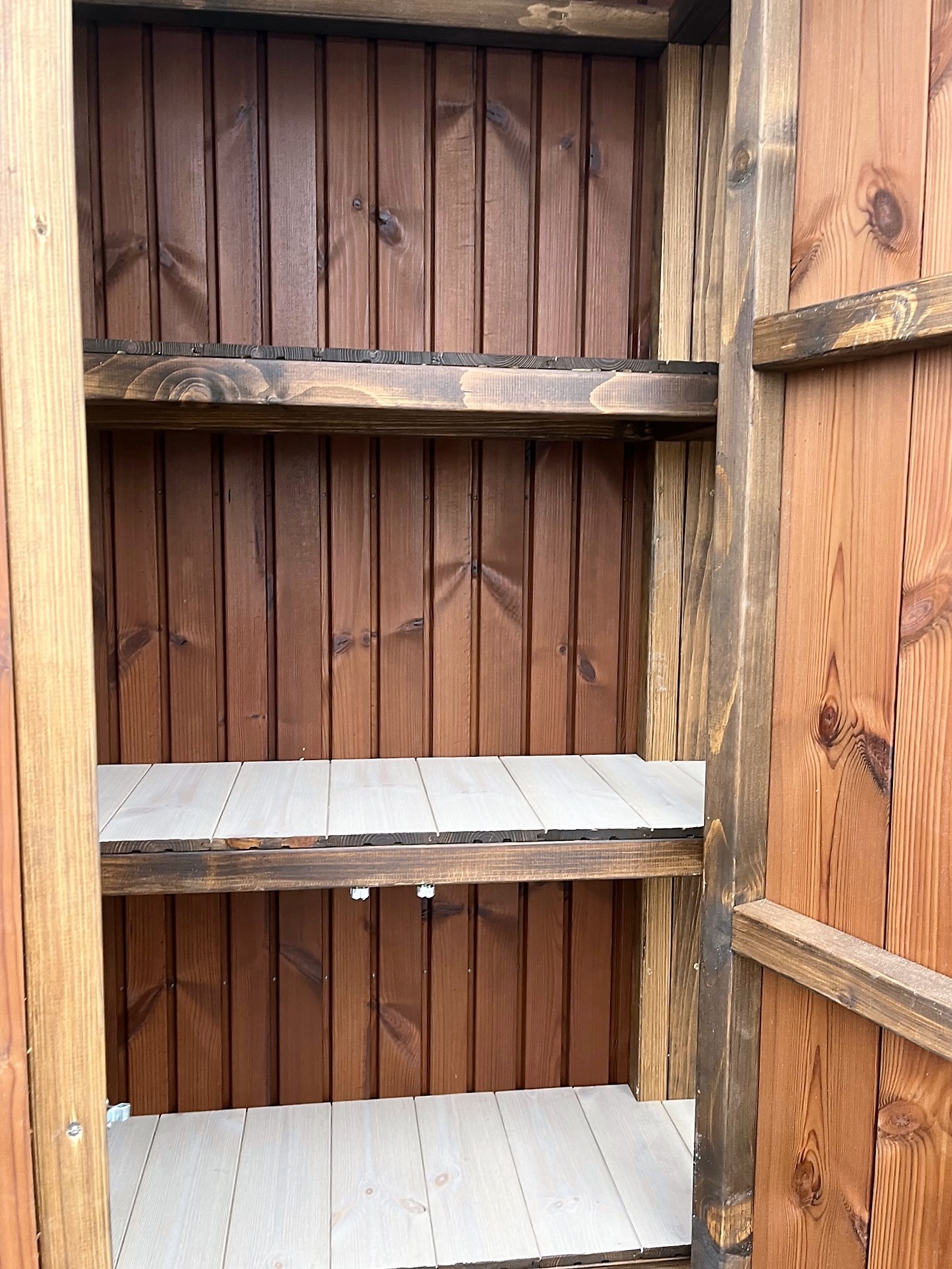 Buitenkasten aan de achterkant: service kolom voor vullen en aftappen; kast voor gasflessen.