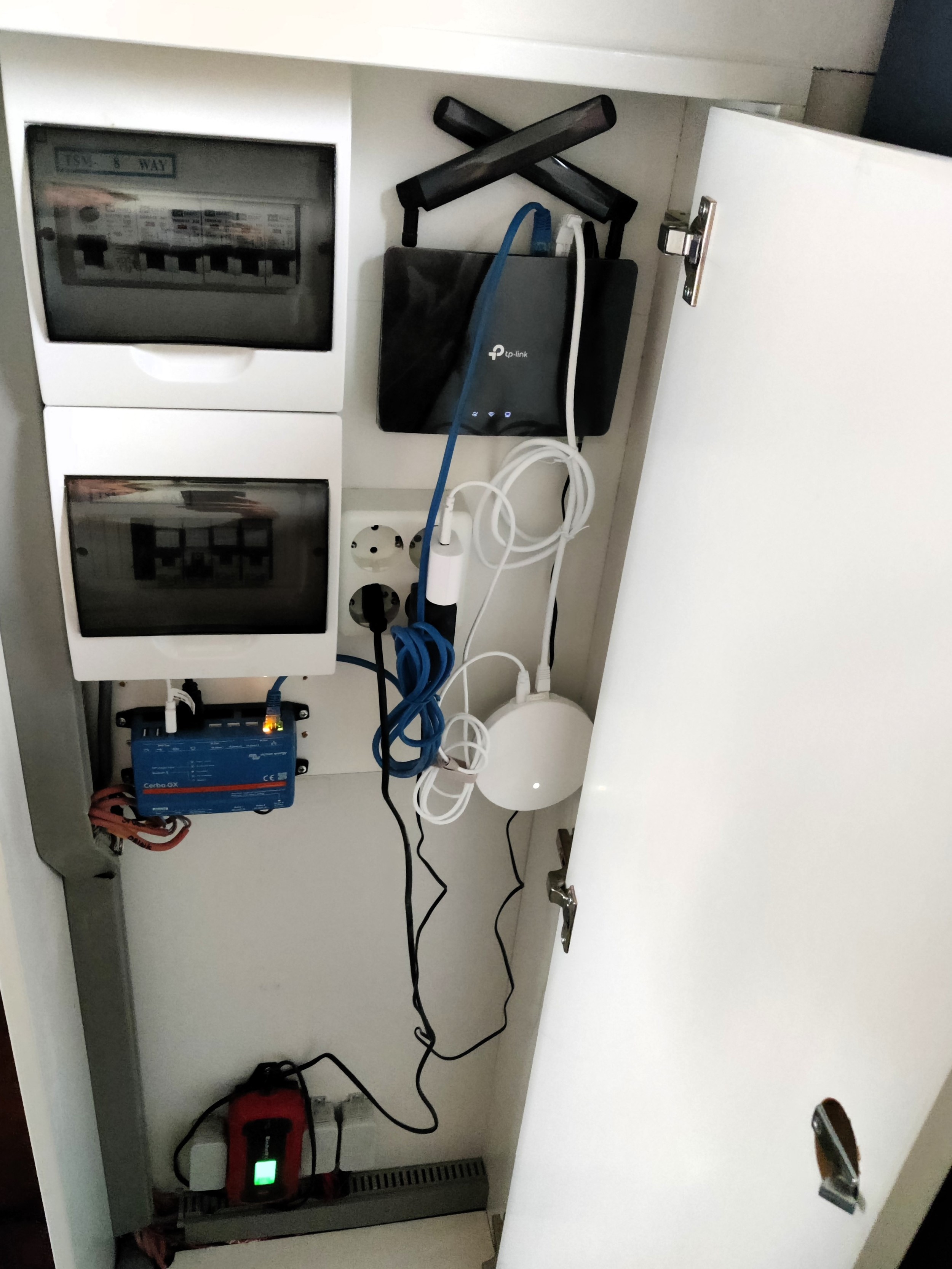 In het demomodel zit een service accu (120 ah loodaccu) zodat alle voorzieningen op 12 volt werken als de boot niet aan de walstroom ligt. Inclusief accudruppelaar.
