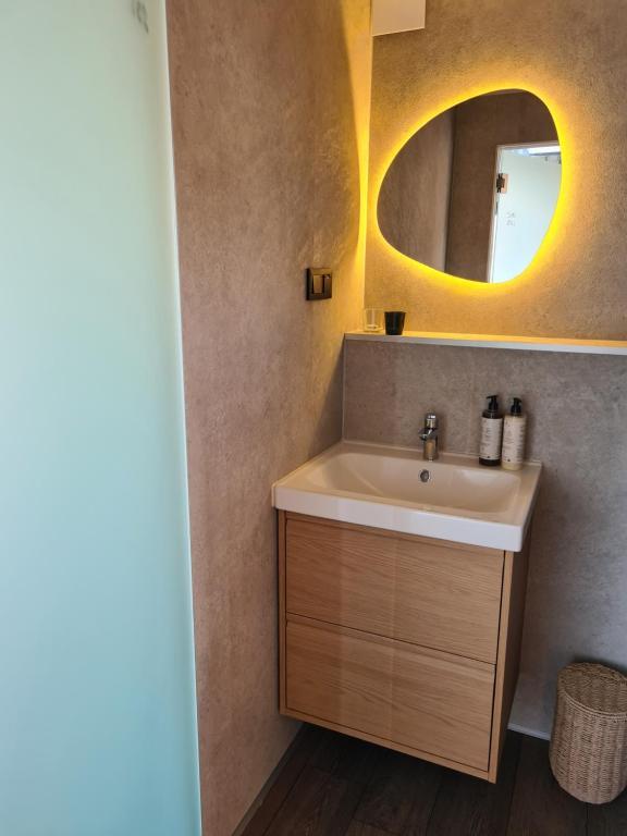 Badkamer: wastafel, douche, spiegel; glazen douchedeur.